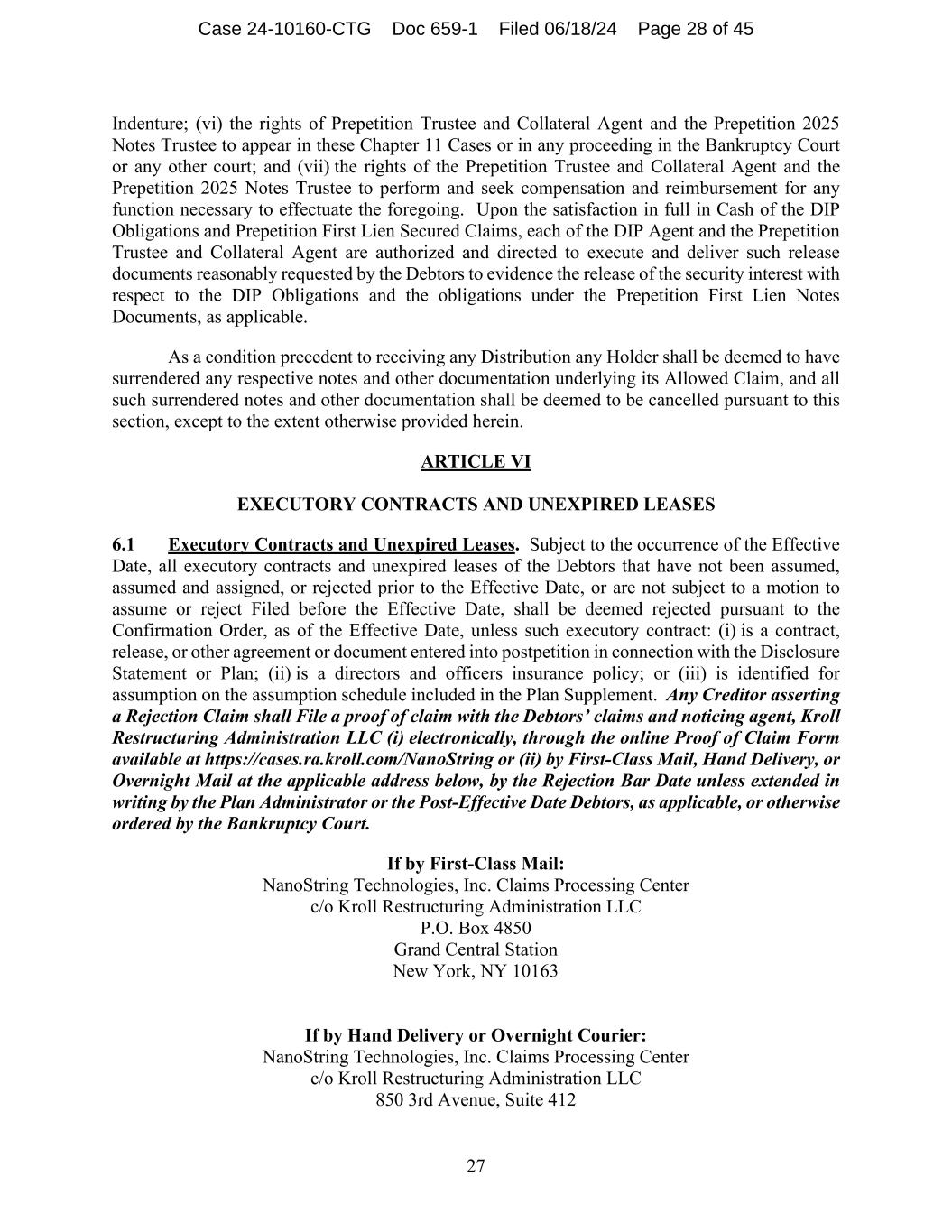 27 Indenture; (vi) the rights of Prepetition Trustee and Collateral Agent and the Prepetition 2025 Notes Trustee to appear in these Chapter 11 Cases or in any proceeding in the Bankruptcy Court or any other court; and (vii) the rights of the Prepetition Trustee and Collateral Agent and the Prepetition 2025 Notes Trustee to perform and seek compensation and reimbursement for any function necessary to effectuate the foregoing. Upon the satisfaction in full in Cash of the DIP Obligations and Prepetition First Lien Secured Claims, each of the DIP Agent and the Prepetition Trustee and Collateral Agent are authorized and directed to execute and deliver such release documents reasonably requested by the Debtors to evidence the release of the security interest with respect to the DIP Obligations and the obligations under the Prepetition First Lien Notes Documents, as applicable. As a condition precedent to receiving any Distribution any Holder shall be deemed to have surrendered any respective notes and other documentation underlying its Allowed Claim, and all such surrendered notes and other documentation shall be deemed to be cancelled pursuant to this section, except to the extent otherwise provided herein. ARTICLE VI EXECUTORY CONTRACTS AND UNEXPIRED LEASES 6.1 Executory Contracts and Unexpired Leases. Subject to the occurrence of the Effective Date, all executory contracts and unexpired leases of the Debtors that have not been assumed, assumed and assigned, or rejected prior to the Effective Date, or are not subject to a motion to assume or reject Filed before the Effective Date, shall be deemed rejected pursuant to the Confirmation Order, as of the Effective Date, unless such executory contract: (i) is a contract, release, or other agreement or document entered into postpetition in connection with the Disclosure Statement or Plan; (ii) is a directors and officers insurance policy; or (iii) is identified for assumption on the assumption schedule included in the Plan Supplement. Any Creditor asserting a Rejection Claim shall File a proof of claim with the Debtors’ claims and noticing agent, Kroll Restructuring Administration LLC (i) electronically, through the online Proof of Claim Form available at https://cases.ra.kroll.com/NanoString or (ii) by First-Class Mail, Hand Delivery, or Overnight Mail at the applicable address below, by the Rejection Bar Date unless extended in writing by the Plan Administrator or the Post-Effective Date Debtors, as applicable, or otherwise ordered by the Bankruptcy Court. If by First-Class Mail: NanoString Technologies, Inc. Claims Processing Center c/o Kroll Restructuring Administration LLC P.O. Box 4850 Grand Central Station New York, NY 10163 If by Hand Delivery or Overnight Courier: NanoString Technologies, Inc. Claims Processing Center c/o Kroll Restructuring Administration LLC 850 3rd Avenue, Suite 412 Case 24-10160-CTG Doc 659-1 Filed 06/18/24 Page 28 of 45