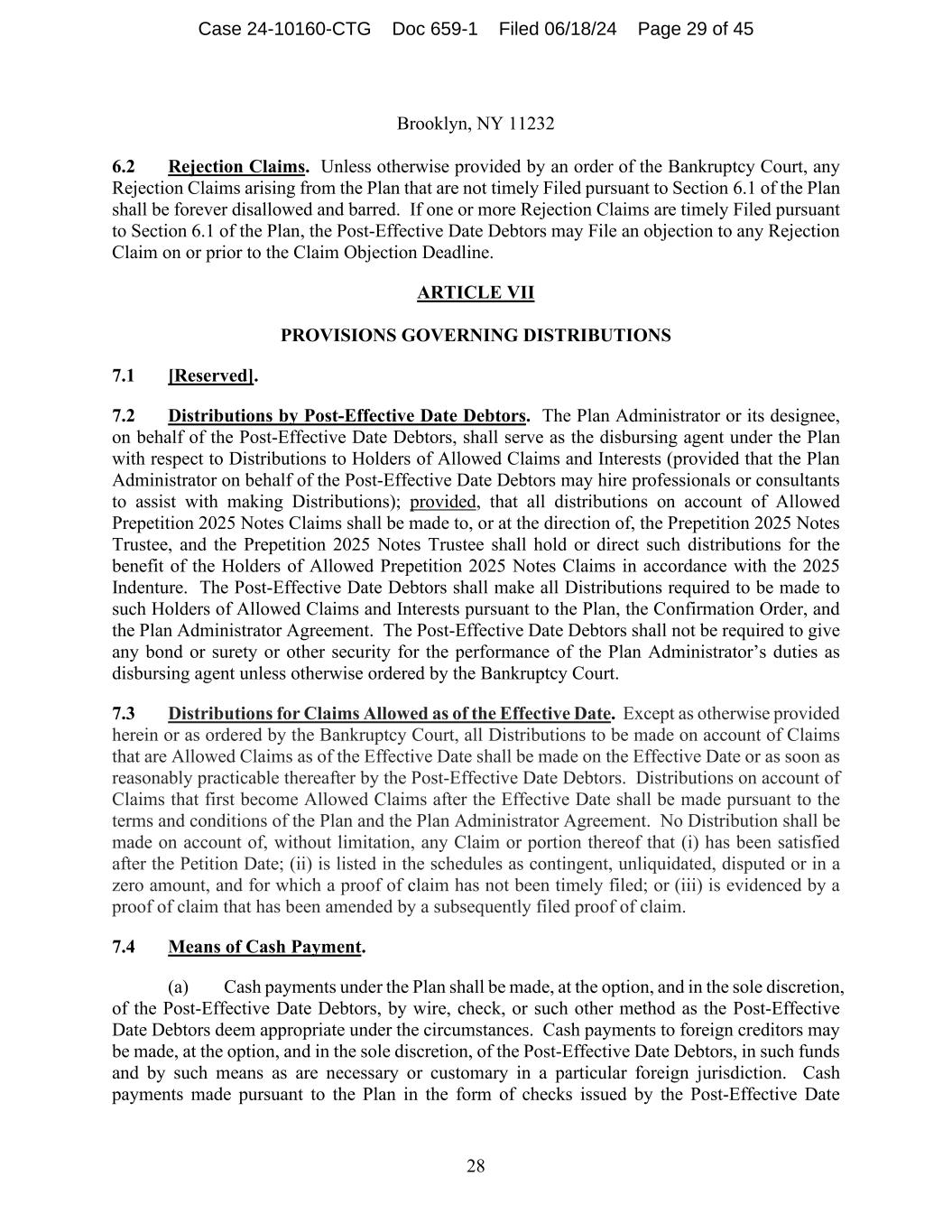 28 Brooklyn, NY 11232 6.2 Rejection Claims. Unless otherwise provided by an order of the Bankruptcy Court, any Rejection Claims arising from the Plan that are not timely Filed pursuant to Section 6.1 of the Plan shall be forever disallowed and barred. If one or more Rejection Claims are timely Filed pursuant to Section 6.1 of the Plan, the Post-Effective Date Debtors may File an objection to any Rejection Claim on or prior to the Claim Objection Deadline. ARTICLE VII PROVISIONS GOVERNING DISTRIBUTIONS 7.1 [Reserved]. 7.2 Distributions by Post-Effective Date Debtors. The Plan Administrator or its designee, on behalf of the Post-Effective Date Debtors, shall serve as the disbursing agent under the Plan with respect to Distributions to Holders of Allowed Claims and Interests (provided that the Plan Administrator on behalf of the Post-Effective Date Debtors may hire professionals or consultants to assist with making Distributions); provided, that all distributions on account of Allowed Prepetition 2025 Notes Claims shall be made to, or at the direction of, the Prepetition 2025 Notes Trustee, and the Prepetition 2025 Notes Trustee shall hold or direct such distributions for the benefit of the Holders of Allowed Prepetition 2025 Notes Claims in accordance with the 2025 Indenture. The Post-Effective Date Debtors shall make all Distributions required to be made to such Holders of Allowed Claims and Interests pursuant to the Plan, the Confirmation Order, and the Plan Administrator Agreement. The Post-Effective Date Debtors shall not be required to give any bond or surety or other security for the performance of the Plan Administrator’s duties as disbursing agent unless otherwise ordered by the Bankruptcy Court. 7.3 Distributions for Claims Allowed as of the Effective Date. Except as otherwise provided herein or as ordered by the Bankruptcy Court, all Distributions to be made on account of Claims that are Allowed Claims as of the Effective Date shall be made on the Effective Date or as soon as reasonably practicable thereafter by the Post-Effective Date Debtors. Distributions on account of Claims that first become Allowed Claims after the Effective Date shall be made pursuant to the terms and conditions of the Plan and the Plan Administrator Agreement. No Distribution shall be made on account of, without limitation, any Claim or portion thereof that (i) has been satisfied after the Petition Date; (ii) is listed in the schedules as contingent, unliquidated, disputed or in a zero amount, and for which a proof of claim has not been timely filed; or (iii) is evidenced by a proof of claim that has been amended by a subsequently filed proof of claim. 7.4 Means of Cash Payment. (a) Cash payments under the Plan shall be made, at the option, and in the sole discretion, of the Post-Effective Date Debtors, by wire, check, or such other method as the Post-Effective Date Debtors deem appropriate under the circumstances. Cash payments to foreign creditors may be made, at the option, and in the sole discretion, of the Post-Effective Date Debtors, in such funds and by such means as are necessary or customary in a particular foreign jurisdiction. Cash payments made pursuant to the Plan in the form of checks issued by the Post-Effective Date Case 24-10160-CTG Doc 659-1 Filed 06/18/24 Page 29 of 45