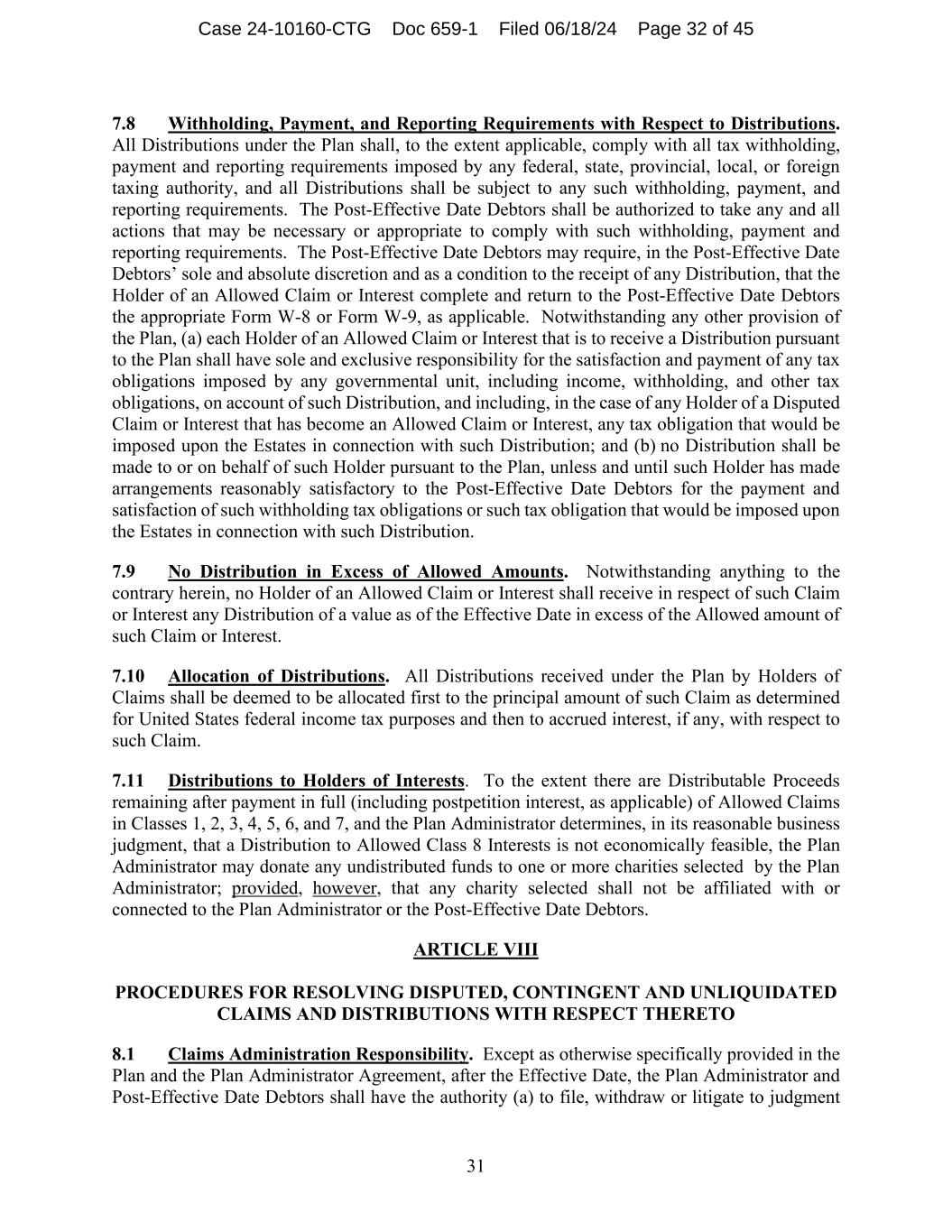 31 7.8 Withholding, Payment, and Reporting Requirements with Respect to Distributions. All Distributions under the Plan shall, to the extent applicable, comply with all tax withholding, payment and reporting requirements imposed by any federal, state, provincial, local, or foreign taxing authority, and all Distributions shall be subject to any such withholding, payment, and reporting requirements. The Post-Effective Date Debtors shall be authorized to take any and all actions that may be necessary or appropriate to comply with such withholding, payment and reporting requirements. The Post-Effective Date Debtors may require, in the Post-Effective Date Debtors’ sole and absolute discretion and as a condition to the receipt of any Distribution, that the Holder of an Allowed Claim or Interest complete and return to the Post-Effective Date Debtors the appropriate Form W-8 or Form W-9, as applicable. Notwithstanding any other provision of the Plan, (a) each Holder of an Allowed Claim or Interest that is to receive a Distribution pursuant to the Plan shall have sole and exclusive responsibility for the satisfaction and payment of any tax obligations imposed by any governmental unit, including income, withholding, and other tax obligations, on account of such Distribution, and including, in the case of any Holder of a Disputed Claim or Interest that has become an Allowed Claim or Interest, any tax obligation that would be imposed upon the Estates in connection with such Distribution; and (b) no Distribution shall be made to or on behalf of such Holder pursuant to the Plan, unless and until such Holder has made arrangements reasonably satisfactory to the Post-Effective Date Debtors for the payment and satisfaction of such withholding tax obligations or such tax obligation that would be imposed upon the Estates in connection with such Distribution. 7.9 No Distribution in Excess of Allowed Amounts. Notwithstanding anything to the contrary herein, no Holder of an Allowed Claim or Interest shall receive in respect of such Claim or Interest any Distribution of a value as of the Effective Date in excess of the Allowed amount of such Claim or Interest. 7.10 Allocation of Distributions. All Distributions received under the Plan by Holders of Claims shall be deemed to be allocated first to the principal amount of such Claim as determined for United States federal income tax purposes and then to accrued interest, if any, with respect to such Claim. 7.11 Distributions to Holders of Interests. To the extent there are Distributable Proceeds remaining after payment in full (including postpetition interest, as applicable) of Allowed Claims in Classes 1, 2, 3, 4, 5, 6, and 7, and the Plan Administrator determines, in its reasonable business judgment, that a Distribution to Allowed Class 8 Interests is not economically feasible, the Plan Administrator may donate any undistributed funds to one or more charities selected by the Plan Administrator; provided, however, that any charity selected shall not be affiliated with or connected to the Plan Administrator or the Post-Effective Date Debtors. ARTICLE VIII PROCEDURES FOR RESOLVING DISPUTED, CONTINGENT AND UNLIQUIDATED CLAIMS AND DISTRIBUTIONS WITH RESPECT THERETO 8.1 Claims Administration Responsibility. Except as otherwise specifically provided in the Plan and the Plan Administrator Agreement, after the Effective Date, the Plan Administrator and Post-Effective Date Debtors shall have the authority (a) to file, withdraw or litigate to judgment Case 24-10160-CTG Doc 659-1 Filed 06/18/24 Page 32 of 45