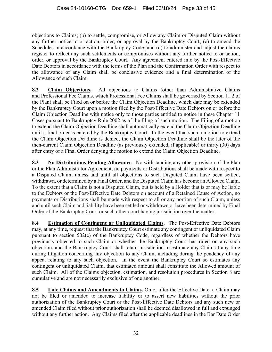32 objections to Claims; (b) to settle, compromise, or Allow any Claim or Disputed Claim without any further notice to or action, order, or approval by the Bankruptcy Court; (c) to amend the Schedules in accordance with the Bankruptcy Code; and (d) to administer and adjust the claims register to reflect any such settlements or compromises without any further notice to or action, order, or approval by the Bankruptcy Court. Any agreement entered into by the Post-Effective Date Debtors in accordance with the terms of the Plan and the Confirmation Order with respect to the allowance of any Claim shall be conclusive evidence and a final determination of the Allowance of such Claim. 8.2 Claim Objections. All objections to Claims (other than Administrative Claims and Professional Fee Claims, which Professional Fee Claims shall be governed by Section 11.2 of the Plan) shall be Filed on or before the Claim Objection Deadline, which date may be extended by the Bankruptcy Court upon a motion filed by the Post-Effective Date Debtors on or before the Claim Objection Deadline with notice only to those parties entitled to notice in these Chapter 11 Cases pursuant to Bankruptcy Rule 2002 as of the filing of such motion. The Filing of a motion to extend the Claim Objection Deadline shall automatically extend the Claim Objection Deadline until a final order is entered by the Bankruptcy Court. In the event that such a motion to extend the Claim Objection Deadline is denied, the Claim Objection Deadline shall be the later of the then-current Claim Objection Deadline (as previously extended, if applicable) or thirty (30) days after entry of a Final Order denying the motion to extend the Claim Objection Deadline. 8.3 No Distributions Pending Allowance. Notwithstanding any other provision of the Plan or the Plan Administrator Agreement, no payments or Distributions shall be made with respect to a Disputed Claim, unless and until all objections to such Disputed Claim have been settled, withdrawn, or determined by a Final Order, and the Disputed Claim has become an Allowed Claim. To the extent that a Claim is not a Disputed Claim, but is held by a Holder that is or may be liable to the Debtors or the Post-Effective Date Debtors on account of a Retained Cause of Action, no payments or Distributions shall be made with respect to all or any portion of such Claim, unless and until such Claim and liability have been settled or withdrawn or have been determined by Final Order of the Bankruptcy Court or such other court having jurisdiction over the matter. 8.4 Estimation of Contingent or Unliquidated Claims. The Post-Effective Date Debtors may, at any time, request that the Bankruptcy Court estimate any contingent or unliquidated Claim pursuant to section 502(c) of the Bankruptcy Code, regardless of whether the Debtors have previously objected to such Claim or whether the Bankruptcy Court has ruled on any such objection, and the Bankruptcy Court shall retain jurisdiction to estimate any Claim at any time during litigation concerning any objection to any Claim, including during the pendency of any appeal relating to any such objection. In the event the Bankruptcy Court so estimates any contingent or unliquidated Claim, that estimated amount shall constitute the Allowed amount of such Claim. All of the Claims objection, estimation, and resolution procedures in Section 8 are cumulative and are not necessarily exclusive of one another. 8.5 Late Claims and Amendments to Claims. On or after the Effective Date, a Claim may not be filed or amended to increase liability or to assert new liabilities without the prior authorization of the Bankruptcy Court or the Post-Effective Date Debtors and any such new or amended Claim filed without prior authorization shall be deemed disallowed in full and expunged without any further action. Any Claims filed after the applicable deadlines in the Bar Date Order Case 24-10160-CTG Doc 659-1 Filed 06/18/24 Page 33 of 45