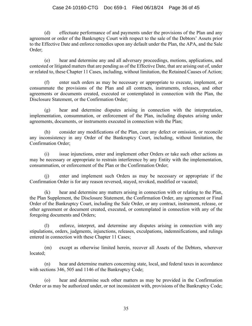35 (d) effectuate performance of and payments under the provisions of the Plan and any agreement or order of the Bankruptcy Court with respect to the sale of the Debtors’ Assets prior to the Effective Date and enforce remedies upon any default under the Plan, the APA, and the Sale Order; (e) hear and determine any and all adversary proceedings, motions, applications, and contested or litigated matters that are pending as of the Effective Date, that are arising out of, under or related to, these Chapter 11 Cases, including, without limitation, the Retained Causes of Action; (f) enter such orders as may be necessary or appropriate to execute, implement, or consummate the provisions of the Plan and all contracts, instruments, releases, and other agreements or documents created, executed or contemplated in connection with the Plan, the Disclosure Statement, or the Confirmation Order; (g) hear and determine disputes arising in connection with the interpretation, implementation, consummation, or enforcement of the Plan, including disputes arising under agreements, documents, or instruments executed in connection with the Plan; (h) consider any modifications of the Plan, cure any defect or omission, or reconcile any inconsistency in any Order of the Bankruptcy Court, including, without limitation, the Confirmation Order; (i) issue injunctions, enter and implement other Orders or take such other actions as may be necessary or appropriate to restrain interference by any Entity with the implementation, consummation, or enforcement of the Plan or the Confirmation Order; (j) enter and implement such Orders as may be necessary or appropriate if the Confirmation Order is for any reason reversed, stayed, revoked, modified or vacated; (k) hear and determine any matters arising in connection with or relating to the Plan, the Plan Supplement, the Disclosure Statement, the Confirmation Order, any agreement or Final Order of the Bankruptcy Court, including the Sale Order, or any contract, instrument, release, or other agreement or document created, executed, or contemplated in connection with any of the foregoing documents and Orders; (l) enforce, interpret, and determine any disputes arising in connection with any stipulations, orders, judgments, injunctions, releases, exculpations, indemnifications, and rulings entered in connection with these Chapter 11 Cases; (m) except as otherwise limited herein, recover all Assets of the Debtors, wherever located; (n) hear and determine matters concerning state, local, and federal taxes in accordance with sections 346, 505 and 1146 of the Bankruptcy Code; (o) hear and determine such other matters as may be provided in the Confirmation Order or as may be authorized under, or not inconsistent with, provisions of the Bankruptcy Code; Case 24-10160-CTG Doc 659-1 Filed 06/18/24 Page 36 of 45