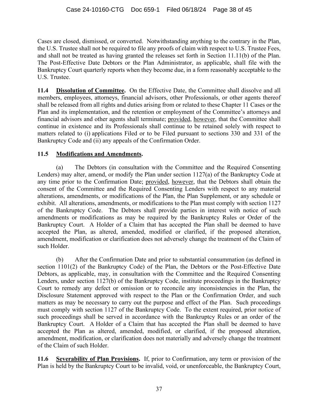 37 Cases are closed, dismissed, or converted. Notwithstanding anything to the contrary in the Plan, the U.S. Trustee shall not be required to file any proofs of claim with respect to U.S. Trustee Fees, and shall not be treated as having granted the releases set forth in Section 11.11(b) of the Plan. The Post-Effective Date Debtors or the Plan Administrator, as applicable, shall file with the Bankruptcy Court quarterly reports when they become due, in a form reasonably acceptable to the U.S. Trustee. 11.4 Dissolution of Committee. On the Effective Date, the Committee shall dissolve and all members, employees, attorneys, financial advisors, other Professionals, or other agents thereof shall be released from all rights and duties arising from or related to these Chapter 11 Cases or the Plan and its implementation, and the retention or employment of the Committee’s attorneys and financial advisors and other agents shall terminate; provided, however, that the Committee shall continue in existence and its Professionals shall continue to be retained solely with respect to matters related to (i) applications Filed or to be Filed pursuant to sections 330 and 331 of the Bankruptcy Code and (ii) any appeals of the Confirmation Order. 11.5 Modifications and Amendments. (a) The Debtors (in consultation with the Committee and the Required Consenting Lenders) may alter, amend, or modify the Plan under section 1127(a) of the Bankruptcy Code at any time prior to the Confirmation Date; provided, however, that the Debtors shall obtain the consent of the Committee and the Required Consenting Lenders with respect to any material alterations, amendments, or modifications of the Plan, the Plan Supplement, or any schedule or exhibit. All alterations, amendments, or modifications to the Plan must comply with section 1127 of the Bankruptcy Code. The Debtors shall provide parties in interest with notice of such amendments or modifications as may be required by the Bankruptcy Rules or Order of the Bankruptcy Court. A Holder of a Claim that has accepted the Plan shall be deemed to have accepted the Plan, as altered, amended, modified or clarified, if the proposed alteration, amendment, modification or clarification does not adversely change the treatment of the Claim of such Holder. (b) After the Confirmation Date and prior to substantial consummation (as defined in section 1101(2) of the Bankruptcy Code) of the Plan, the Debtors or the Post-Effective Date Debtors, as applicable, may, in consultation with the Committee and the Required Consenting Lenders, under section 1127(b) of the Bankruptcy Code, institute proceedings in the Bankruptcy Court to remedy any defect or omission or to reconcile any inconsistencies in the Plan, the Disclosure Statement approved with respect to the Plan or the Confirmation Order, and such matters as may be necessary to carry out the purpose and effect of the Plan. Such proceedings must comply with section 1127 of the Bankruptcy Code. To the extent required, prior notice of such proceedings shall be served in accordance with the Bankruptcy Rules or an order of the Bankruptcy Court. A Holder of a Claim that has accepted the Plan shall be deemed to have accepted the Plan as altered, amended, modified, or clarified, if the proposed alteration, amendment, modification, or clarification does not materially and adversely change the treatment of the Claim of such Holder. 11.6 Severability of Plan Provisions. If, prior to Confirmation, any term or provision of the Plan is held by the Bankruptcy Court to be invalid, void, or unenforceable, the Bankruptcy Court, Case 24-10160-CTG Doc 659-1 Filed 06/18/24 Page 38 of 45