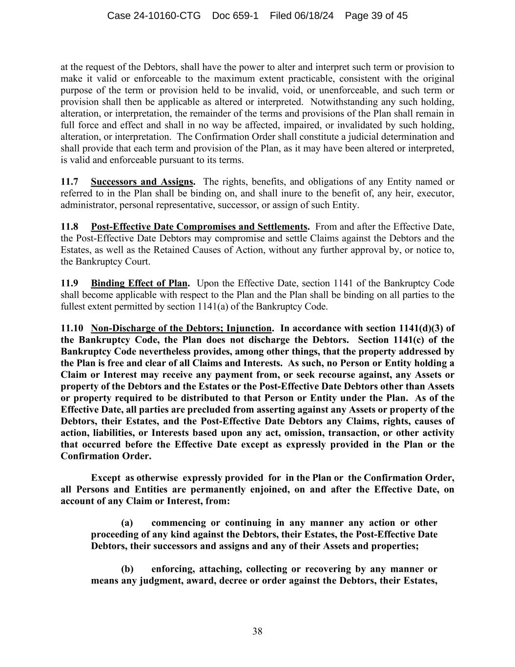 38 at the request of the Debtors, shall have the power to alter and interpret such term or provision to make it valid or enforceable to the maximum extent practicable, consistent with the original purpose of the term or provision held to be invalid, void, or unenforceable, and such term or provision shall then be applicable as altered or interpreted. Notwithstanding any such holding, alteration, or interpretation, the remainder of the terms and provisions of the Plan shall remain in full force and effect and shall in no way be affected, impaired, or invalidated by such holding, alteration, or interpretation. The Confirmation Order shall constitute a judicial determination and shall provide that each term and provision of the Plan, as it may have been altered or interpreted, is valid and enforceable pursuant to its terms. 11.7 Successors and Assigns. The rights, benefits, and obligations of any Entity named or referred to in the Plan shall be binding on, and shall inure to the benefit of, any heir, executor, administrator, personal representative, successor, or assign of such Entity. 11.8 Post-Effective Date Compromises and Settlements. From and after the Effective Date, the Post-Effective Date Debtors may compromise and settle Claims against the Debtors and the Estates, as well as the Retained Causes of Action, without any further approval by, or notice to, the Bankruptcy Court. 11.9 Binding Effect of Plan. Upon the Effective Date, section 1141 of the Bankruptcy Code shall become applicable with respect to the Plan and the Plan shall be binding on all parties to the fullest extent permitted by section 1141(a) of the Bankruptcy Code. 11.10 Non-Discharge of the Debtors; Injunction. In accordance with section 1141(d)(3) of the Bankruptcy Code, the Plan does not discharge the Debtors. Section 1141(c) of the Bankruptcy Code nevertheless provides, among other things, that the property addressed by the Plan is free and clear of all Claims and Interests. As such, no Person or Entity holding a Claim or Interest may receive any payment from, or seek recourse against, any Assets or property of the Debtors and the Estates or the Post-Effective Date Debtors other than Assets or property required to be distributed to that Person or Entity under the Plan. As of the Effective Date, all parties are precluded from asserting against any Assets or property of the Debtors, their Estates, and the Post-Effective Date Debtors any Claims, rights, causes of action, liabilities, or Interests based upon any act, omission, transaction, or other activity that occurred before the Effective Date except as expressly provided in the Plan or the Confirmation Order. Except as otherwise expressly provided for in the Plan or the Confirmation Order, all Persons and Entities are permanently enjoined, on and after the Effective Date, on account of any Claim or Interest, from: (a) commencing or continuing in any manner any action or other proceeding of any kind against the Debtors, their Estates, the Post-Effective Date Debtors, their successors and assigns and any of their Assets and properties; (b) enforcing, attaching, collecting or recovering by any manner or means any judgment, award, decree or order against the Debtors, their Estates, Case 24-10160-CTG Doc 659-1 Filed 06/18/24 Page 39 of 45