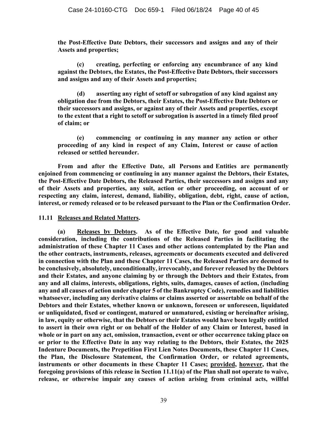 39 the Post-Effective Date Debtors, their successors and assigns and any of their Assets and properties; (c) creating, perfecting or enforcing any encumbrance of any kind against the Debtors, the Estates, the Post-Effective Date Debtors, their successors and assigns and any of their Assets and properties; (d) asserting any right of setoff or subrogation of any kind against any obligation due from the Debtors, their Estates, the Post-Effective Date Debtors or their successors and assigns, or against any of their Assets and properties, except to the extent that a right to setoff or subrogation is asserted in a timely filed proof of claim; or (e) commencing or continuing in any manner any action or other proceeding of any kind in respect of any Claim, Interest or cause of action released or settled hereunder. From and after the Effective Date, all Persons and Entities are permanently enjoined from commencing or continuing in any manner against the Debtors, their Estates, the Post-Effective Date Debtors, the Released Parties, their successors and assigns and any of their Assets and properties, any suit, action or other proceeding, on account of or respecting any claim, interest, demand, liability, obligation, debt, right, cause of action, interest, or remedy released or to be released pursuant to the Plan or the Confirmation Order. 11.11 Releases and Related Matters. (a) Releases by Debtors. As of the Effective Date, for good and valuable consideration, including the contributions of the Released Parties in facilitating the administration of these Chapter 11 Cases and other actions contemplated by the Plan and the other contracts, instruments, releases, agreements or documents executed and delivered in connection with the Plan and these Chapter 11 Cases, the Released Parties are deemed to be conclusively, absolutely, unconditionally, irrevocably, and forever released by the Debtors and their Estates, and anyone claiming by or through the Debtors and their Estates, from any and all claims, interests, obligations, rights, suits, damages, causes of action, (including any and all causes of action under chapter 5 of the Bankruptcy Code), remedies and liabilities whatsoever, including any derivative claims or claims asserted or assertable on behalf of the Debtors and their Estates, whether known or unknown, foreseen or unforeseen, liquidated or unliquidated, fixed or contingent, matured or unmatured, existing or hereinafter arising, in law, equity or otherwise, that the Debtors or their Estates would have been legally entitled to assert in their own right or on behalf of the Holder of any Claim or Interest, based in whole or in part on any act, omission, transaction, event or other occurrence taking place on or prior to the Effective Date in any way relating to the Debtors, their Estates, the 2025 Indenture Documents, the Prepetition First Lien Notes Documents, these Chapter 11 Cases, the Plan, the Disclosure Statement, the Confirmation Order, or related agreements, instruments or other documents in these Chapter 11 Cases; provided, however, that the foregoing provisions of this release in Section 11.11(a) of the Plan shall not operate to waive, release, or otherwise impair any causes of action arising from criminal acts, willful Case 24-10160-CTG Doc 659-1 Filed 06/18/24 Page 40 of 45