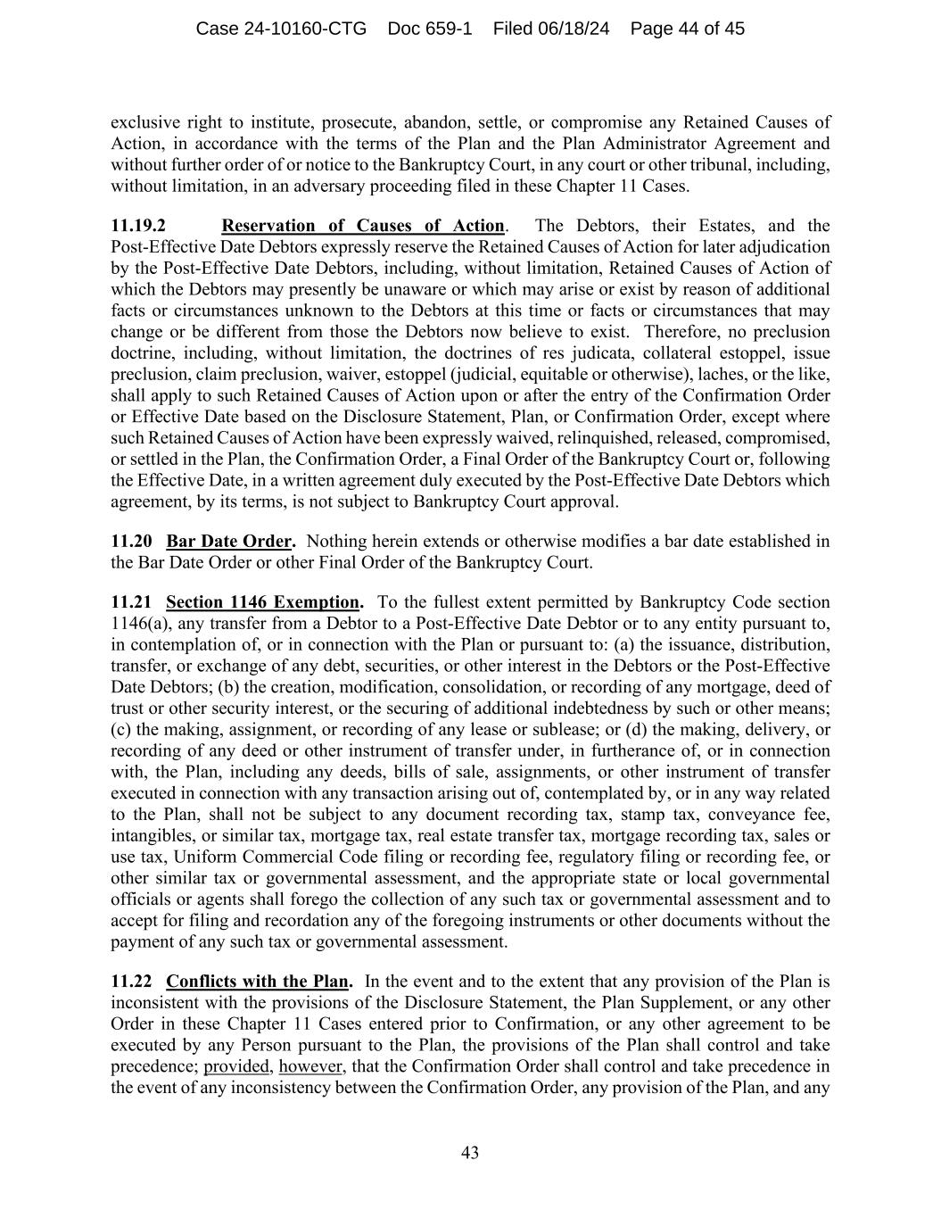 43 exclusive right to institute, prosecute, abandon, settle, or compromise any Retained Causes of Action, in accordance with the terms of the Plan and the Plan Administrator Agreement and without further order of or notice to the Bankruptcy Court, in any court or other tribunal, including, without limitation, in an adversary proceeding filed in these Chapter 11 Cases. 11.19.2 Reservation of Causes of Action. The Debtors, their Estates, and the Post-Effective Date Debtors expressly reserve the Retained Causes of Action for later adjudication by the Post-Effective Date Debtors, including, without limitation, Retained Causes of Action of which the Debtors may presently be unaware or which may arise or exist by reason of additional facts or circumstances unknown to the Debtors at this time or facts or circumstances that may change or be different from those the Debtors now believe to exist. Therefore, no preclusion doctrine, including, without limitation, the doctrines of res judicata, collateral estoppel, issue preclusion, claim preclusion, waiver, estoppel (judicial, equitable or otherwise), laches, or the like, shall apply to such Retained Causes of Action upon or after the entry of the Confirmation Order or Effective Date based on the Disclosure Statement, Plan, or Confirmation Order, except where such Retained Causes of Action have been expressly waived, relinquished, released, compromised, or settled in the Plan, the Confirmation Order, a Final Order of the Bankruptcy Court or, following the Effective Date, in a written agreement duly executed by the Post-Effective Date Debtors which agreement, by its terms, is not subject to Bankruptcy Court approval. 11.20 Bar Date Order. Nothing herein extends or otherwise modifies a bar date established in the Bar Date Order or other Final Order of the Bankruptcy Court. 11.21 Section 1146 Exemption. To the fullest extent permitted by Bankruptcy Code section 1146(a), any transfer from a Debtor to a Post-Effective Date Debtor or to any entity pursuant to, in contemplation of, or in connection with the Plan or pursuant to: (a) the issuance, distribution, transfer, or exchange of any debt, securities, or other interest in the Debtors or the Post-Effective Date Debtors; (b) the creation, modification, consolidation, or recording of any mortgage, deed of trust or other security interest, or the securing of additional indebtedness by such or other means; (c) the making, assignment, or recording of any lease or sublease; or (d) the making, delivery, or recording of any deed or other instrument of transfer under, in furtherance of, or in connection with, the Plan, including any deeds, bills of sale, assignments, or other instrument of transfer executed in connection with any transaction arising out of, contemplated by, or in any way related to the Plan, shall not be subject to any document recording tax, stamp tax, conveyance fee, intangibles, or similar tax, mortgage tax, real estate transfer tax, mortgage recording tax, sales or use tax, Uniform Commercial Code filing or recording fee, regulatory filing or recording fee, or other similar tax or governmental assessment, and the appropriate state or local governmental officials or agents shall forego the collection of any such tax or governmental assessment and to accept for filing and recordation any of the foregoing instruments or other documents without the payment of any such tax or governmental assessment. 11.22 Conflicts with the Plan. In the event and to the extent that any provision of the Plan is inconsistent with the provisions of the Disclosure Statement, the Plan Supplement, or any other Order in these Chapter 11 Cases entered prior to Confirmation, or any other agreement to be executed by any Person pursuant to the Plan, the provisions of the Plan shall control and take precedence; provided, however, that the Confirmation Order shall control and take precedence in the event of any inconsistency between the Confirmation Order, any provision of the Plan, and any Case 24-10160-CTG Doc 659-1 Filed 06/18/24 Page 44 of 45