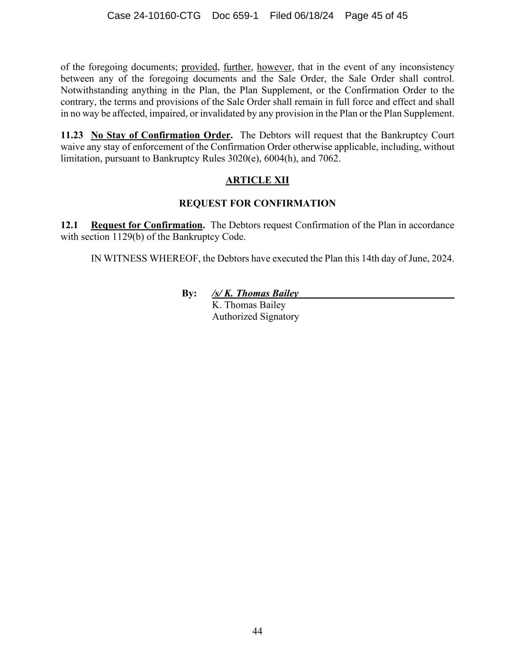 44 of the foregoing documents; provided, further, however, that in the event of any inconsistency between any of the foregoing documents and the Sale Order, the Sale Order shall control. Notwithstanding anything in the Plan, the Plan Supplement, or the Confirmation Order to the contrary, the terms and provisions of the Sale Order shall remain in full force and effect and shall in no way be affected, impaired, or invalidated by any provision in the Plan or the Plan Supplement. 11.23 No Stay of Confirmation Order. The Debtors will request that the Bankruptcy Court waive any stay of enforcement of the Confirmation Order otherwise applicable, including, without limitation, pursuant to Bankruptcy Rules 3020(e), 6004(h), and 7062. ARTICLE XII REQUEST FOR CONFIRMATION 12.1 Request for Confirmation. The Debtors request Confirmation of the Plan in accordance with section 1129(b) of the Bankruptcy Code. IN WITNESS WHEREOF, the Debtors have executed the Plan this 14th day of June, 2024. By: /s/ K. Thomas Bailey K. Thomas Bailey Authorized Signatory Case 24-10160-CTG Doc 659-1 Filed 06/18/24 Page 45 of 45