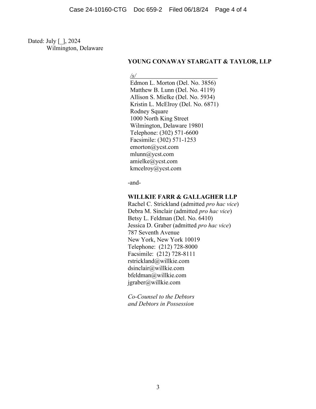 3 Dated: July [_], 2024 Wilmington, Delaware YOUNG CONAWAY STARGATT & TAYLOR, LLP /s/ Edmon L. Morton (Del. No. 3856) Matthew B. Lunn (Del. No. 4119) Allison S. Mielke (Del. No. 5934) Kristin L. McElroy (Del. No. 6871) Rodney Square 1000 North King Street Wilmington, Delaware 19801 Telephone: (302) 571-6600 Facsimile: (302) 571-1253 emorton@ycst.com mlunn@ycst.com amielke@ycst.com kmcelroy@ycst.com -and- WILLKIE FARR & GALLAGHER LLP Rachel C. Strickland (admitted pro hac vice) Debra M. Sinclair (admitted pro hac vice) Betsy L. Feldman (Del. No. 6410) Jessica D. Graber (admitted pro hac vice) 787 Seventh Avenue New York, New York 10019 Telephone: (212) 728-8000 Facsimile: (212) 728-8111 rstrickland@willkie.com dsinclair@willkie.com bfeldman@willkie.com jgraber@willkie.com Co-Counsel to the Debtors and Debtors in Possession Case 24-10160-CTG Doc 659-2 Filed 06/18/24 Page 4 of 4