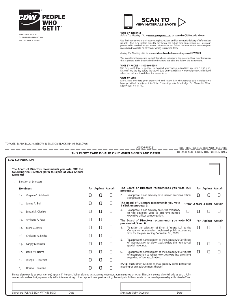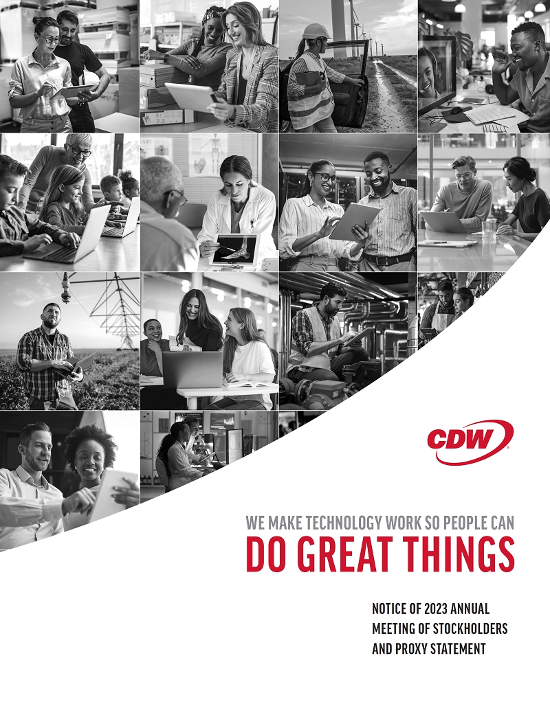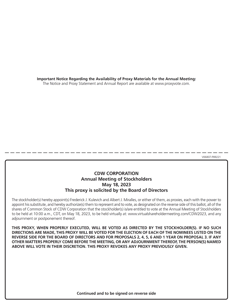 On behalf of our Board of Directors, I would like to invite you to CDW’s 2023 Annual Meeting of Stockholders. The meeting will be held virtually on Thursday, May 18, 2023, at 10:00 a.m. CDT at www.virtualshareholdermeeting.com/CDW2023. The attached Notice of Annual Meeting of Stockholders and Proxy Statement will serve as your guide to the business conducted at the meeting. Your vote is very important. Whether or not you plan to attend the Annual Meeting, we urge you to vote either via the Internet, by telephone, or by signing and returning a proxy card. Please vote as soon as possible so that your shares will be represented. For more information on CDW and to take advantage of our many stockholder resources and tools, we encourage you to visit our Investor Relations website at investor.cdw.com. Thank you for your continued trust in CDW and investment in our business.