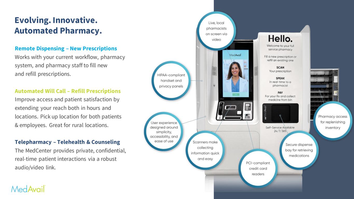 77 Remote Dispensing – New Prescriptions Works with your current workflow, pharmacy system, and pharmacy staff to fill new and refill prescriptions. Automated Will Call – Refill Prescriptions Improve access and patient satisfaction by extending your reach both in hours and locations. Pick up location for both patients & employees. Great for rural locations. Telepharmacy – Telehealth & Counseling The MedCenter provides private, confidential, real-time patient interactions via a robust audio/video link. Evolving. Innovative. Automated Pharmacy.