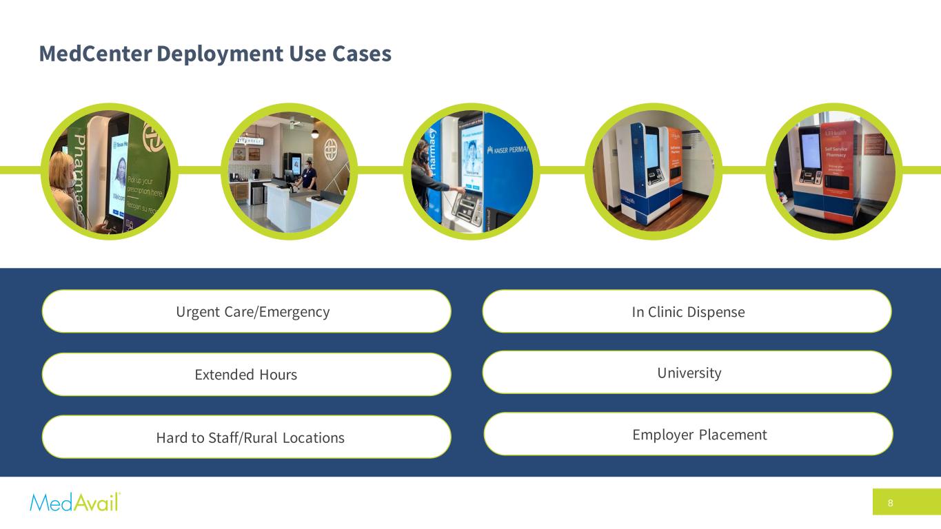 8 MedCenter Deployment Use Cases Urgent Care/Emergency Extended Hours Hard to Staff/Rural Locations In Clinic Dispense University Employer Placement