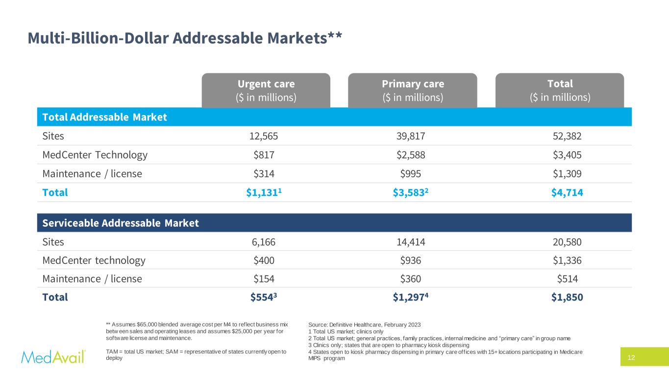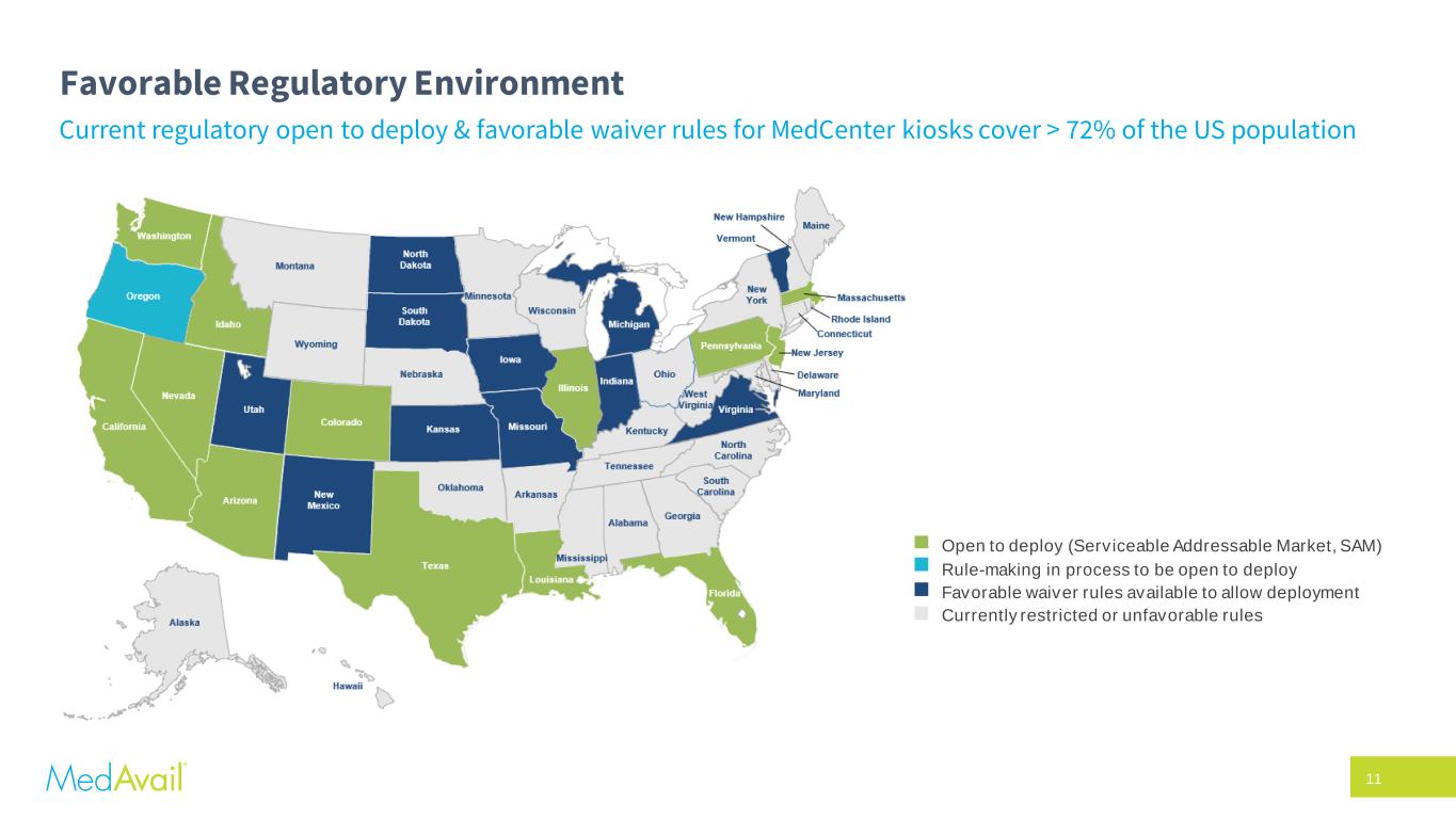 11 Favorable Regulatory Environment Current regulatory open to deploy & favorable waiver rules for MedCenter kiosks cover > 72% of the US population Open to deploy (Serviceable Addressable Market, SAM) Rule-making in process to be open to deploy Favorable waiver rules available to allow deployment Currently restricted or unfavorable rules