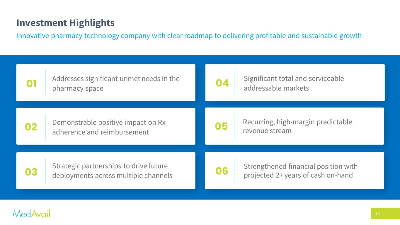 15 2023 Guidance Existing inventory of more than 100 pre-built MedCenter kiosks – not included in the SpotRx divestiture – are ready to be deployed and will drive higher near-term company margins 2022 Pro-Forma 2023E Revenue $1.4 million ~$3 million Full-year net gross margins 47% ~60% Net new dispensing MedCenters1 25 Cumulative net dispensing MedCenters (as of Q1 2023)2 32 1 Net new dispensing MedCenters: Units recorded after completion of shipment and training such that the MedCenter is ready to dispense and generating revenue for MedAvail, which were not previously included in Cumulative Net Dispensing MedCenters. 2 Cumulative net dispensing MedCenters: Cumulative units recorded after completion of shipment and training such that the MedCenter is ready to dispense and generating revenue for MedAvail, but excluding decommissioned units and demo units.