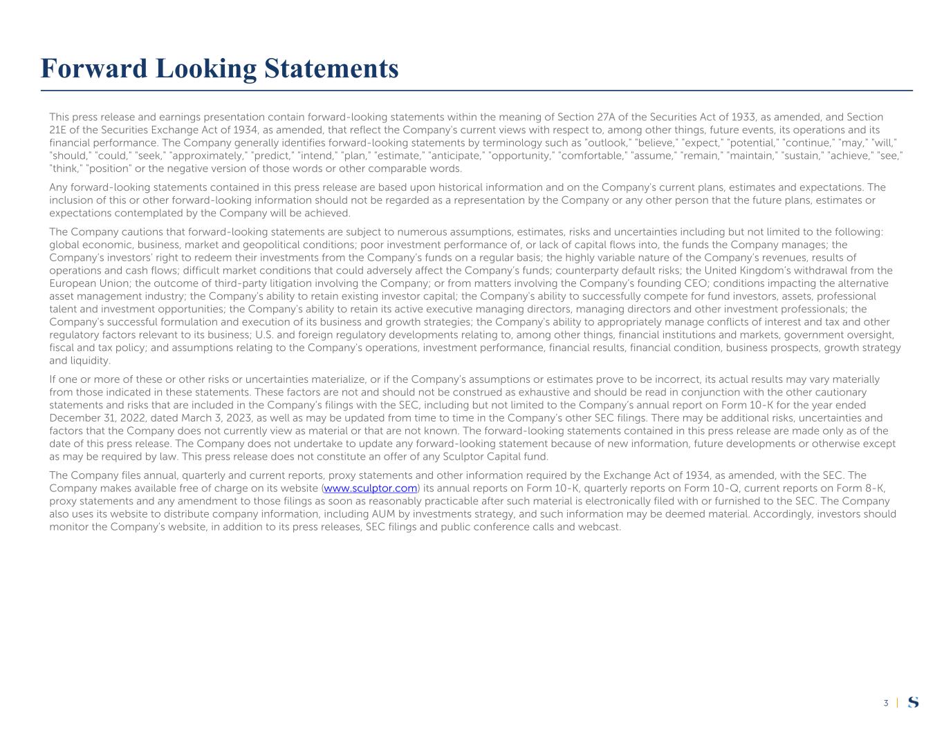 |3 This press release and earnings presentation contain forward-looking statements within the meaning of Section 27A of the Securities Act of 1933, as amended, and Section 21E of the Securities Exchange Act of 1934, as amended, that reflect the Company's current views with respect to, among other things, future events, its operations and its financial performance. The Company generally identifies forward-looking statements by terminology such as "outlook," "believe," "expect," "potential," "continue," "may," "will," "should," "could," "seek," "approximately," "predict," "intend," "plan," "estimate," "anticipate," "opportunity," "comfortable," "assume," "remain," "maintain," "sustain," "achieve," "see," "think," "position" or the negative version of those words or other comparable words. Any forward-looking statements contained in this press release are based upon historical information and on the Company's current plans, estimates and expectations. The inclusion of this or other forward-looking information should not be regarded as a representation by the Company or any other person that the future plans, estimates or expectations contemplated by the Company will be achieved. The Company cautions that forward-looking statements are subject to numerous assumptions, estimates, risks and uncertainties including but not limited to the following: global economic, business, market and geopolitical conditions; poor investment performance of, or lack of capital flows into, the funds the Company manages; the Company’s investors’ right to redeem their investments from the Company’s funds on a regular basis; the highly variable nature of the Company’s revenues, results of operations and cash flows; difficult market conditions that could adversely affect the Company’s funds; counterparty default risks; the United Kingdom’s withdrawal from the European Union; the outcome of third-party litigation involving the Company; or from matters involving the Company’s founding CEO; conditions impacting the alternative asset management industry; the Company's ability to retain existing investor capital; the Company's ability to successfully compete for fund investors, assets, professional talent and investment opportunities; the Company's ability to retain its active executive managing directors, managing directors and other investment professionals; the Company's successful formulation and execution of its business and growth strategies; the Company's ability to appropriately manage conflicts of interest and tax and other regulatory factors relevant to its business; U.S. and foreign regulatory developments relating to, among other things, financial institutions and markets, government oversight, fiscal and tax policy; and assumptions relating to the Company's operations, investment performance, financial results, financial condition, business prospects, growth strategy and liquidity. If one or more of these or other risks or uncertainties materialize, or if the Company’s assumptions or estimates prove to be incorrect, its actual results may vary materially from those indicated in these statements. These factors are not and should not be construed as exhaustive and should be read in conjunction with the other cautionary statements and risks that are included in the Company’s filings with the SEC, including but not limited to the Company’s annual report on Form 10-K for the year ended December 31, 2022, dated March 3, 2023, as well as may be updated from time to time in the Company’s other SEC filings. There may be additional risks, uncertainties and factors that the Company does not currently view as material or that are not known. The forward-looking statements contained in this press release are made only as of the date of this press release. The Company does not undertake to update any forward-looking statement because of new information, future developments or otherwise except as may be required by law. This press release does not constitute an offer of any Sculptor Capital fund. The Company files annual, quarterly and current reports, proxy statements and other information required by the Exchange Act of 1934, as amended, with the SEC. The Company makes available free of charge on its website (www.sculptor.com) its annual reports on Form 10-K, quarterly reports on Form 10-Q, current reports on Form 8-K, proxy statements and any amendment to those filings as soon as reasonably practicable after such material is electronically filed with or furnished to the SEC. The Company also uses its website to distribute company information, including AUM by investments strategy, and such information may be deemed material. Accordingly, investors should monitor the Company's website, in addition to its press releases, SEC filings and public conference calls and webcast. Forward Looking Statements