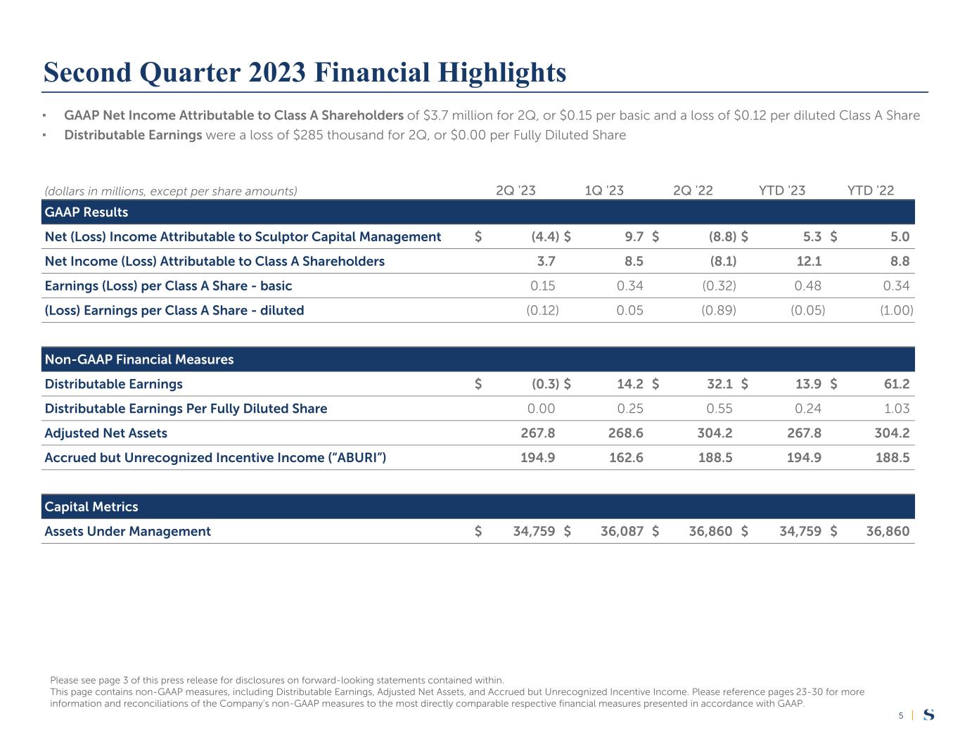|23 (dollars in thousands, except per share amounts) 2Q '23 1Q '23 2Q '22 YTD '23 YTD '22 Net Income (Loss) Attributable to Class A Shareholders—GAAP $ 3,654 $ 8,492 $ (8,052) $ 12,146 $ 8,830 Change in redemption value of redeemable noncontrolling interests (8,004) 1,178 (697) (6,826) (3,765) Net (Loss) Income Allocated to Sculptor Capital Management, Inc.—GAAP $ (4,350) $ 9,670 $ (8,749) $ 5,320 $ 5,065 Equity-based compensation, net of RSUs settled in cash 14,301 13,175 20,804 27,476 43,541 Deferred cash compensation 6,707 6,579 7,730 13,286 16,310 Incentive income profit sharing 1,138 (4,954) (6,802) (3,816) 469 2020 Term Loan non-cash discount accretion 256 247 254 503 500 Depreciation, amortization and net gains and losses on fixed assets 1,035 1,043 1,304 2,078 2,698 Changes in fair value of warrant liabilities 434 (174) (18,740) 260 (43,076) Changes in tax receivable agreement liability 584 (57) (227) 527 (220) Net (gains) losses on investments (5,208) (4,928) 30,838 (10,136) 36,182 Other adjustments (138) (58) — (196) (150) Income taxes (1,190) 12,747 (7,914) 11,557 (947) Net (loss) income allocated to noncontrolling interests (9,822) (6,205) 5,579 (16,027) (6,427) Net income attributable to redeemable noncontrolling interests 1,851 1,499 697 3,350 3,765 Consolidated entities related items: Income of consolidated entities (1,862) (2,696) (311) (4,558) (150) Expenses of consolidated entities 1,304 547 1,668 1,851 1,912 Net (gains) losses of consolidated entities (1,866) (7,877) 6,434 (9,743) 2,294 Economic Income—Non-GAAP $ 3,174 $ 18,558 $ 32,565 $ 21,732 $ 61,766 Payable for taxes and tax receivable agreement—Non-GAAP (3,460) (4,382) (493) (7,842) (519) Distributable Earnings—Non-GAAP $ (286) $ 14,176 $ 32,072 $ 13,890 $ 61,247 Weighted-average Class A Shares outstanding 25,179,467 25,173,834 25,514,364 25,176,667 26,052,478 Weighted-average Partner Units 28,046,833 28,044,741 28,035,152 28,045,793 28,035,151 Weighted-average Class A Restricted Share Units (RSUs) 2,532,586 2,074,695 2,605,627 2,304,905 2,557,642 Weighted-average Restricted Class A Shares1 1,096,970 1,072,269 1,575,134 1,084,688 1,312,520 Weighted-average warrants2 367,194 467,262 1,051,428 432,791 1,675,817 Weighted-Average Fully Diluted Shares 57,223,050 56,832,801 58,781,705 57,044,844 59,633,608 Distributable Earnings Per Fully Diluted Share—Non-GAAP $ 0.00 $ 0.25 $ 0.55 $ 0.24 $ 1.03 1 Represents Restricted Class A Shares ("RSAs") with service based vesting condition. 2 Weighted-average warrants are determined under a treasury stock method. Reconciliation of Non-GAAP Measures to the Respective GAAP Measures - Unaudited