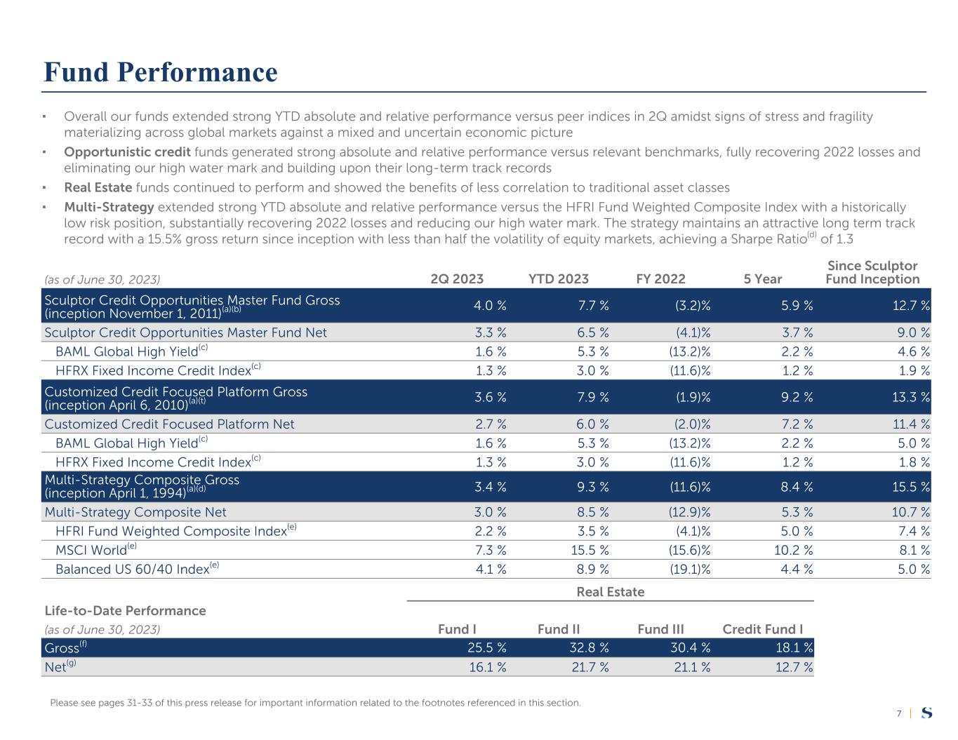 |6 ▪ Gross fund performance for the quarter and year-to-date (“YTD”)1: – Sculptor Credit Opportunities Master Fund was up 4.0% in 2Q and up 7.7% YTD – Customized Credit Focused Platform was up 3.6% in 2Q and up 7.9% YTD – Master Fund was up 3.4% in 2Q and up 9.3% YTD ▪ AUM was $34.8 billion, down $1.3 billion quarter-over-quarter ▪ Fee-paying AUM ("FP AUM") was $28.5 billion or 82% of total AUM ▪ Longer-term AUM was $25.5 billion or 73% of total AUM ▪ Gross inflows were $14 million into multi-strategy funds and $87 million across our platform2, bringing YTD gross inflows to $54 million into multi-strategy funds and $340 million across our platform2 Fund Performance & Assets Under Management Financial Results Recent Developments ▪ GAAP Net Income Attributable to Class A Shareholders was $3.7 million ($0.15 per basic and a loss of $0.12 per diluted Class A Share) ▪ Distributable Earnings were a loss of $285 thousand ($0.00 per Fully Diluted Share) ▪ Adjusted Net Assets were $267.8 million ▪ Accrued But Unrecognized Incentive Income (“ABURI”) was $194.9 million ▪ We have generated a total of $548.5 million of Distribution Holiday Economic Income, compared to the target of $600.0 million On July 24,2023, Rithm Capital Corp. (NYSE: RITM; “Rithm”) and Sculptor announced entry into a definitive agreement (the “Merger Agreement”) under which Rithm will acquire Sculptor in a transaction valued at approximately $639 million, which includes $11.15 per Class A share of Sculptor ▪ Sculptor investment and leadership teams will continue in their roles. Upon completion of the transaction, Sculptor will operate as a subsidiary of Rithm and will continue to be led by Jimmy Levin, as CIO and Executive Managing Partner, reporting to Michael Nierenberg, Chief Executive Officer, President, and Chairman of Rithm ▪ The transaction, subject to customary closing conditions, is expected to close in the fourth quarter of 2023 ▪ Pursuant to Section 6.01 of the Merger Agreement, Sculptor will not pay dividends with respect to periods ending June 30, 2023 or thereafter, while the Merger Agreement remains in effect ▪ Refer to the 8-K dated July 24, 2023 for additional detail Please see page 3 of this press release for disclosures on forward-looking statements contained within. This page contains non-GAAP measures. Please reference pages 23-30 for more information and reconciliations of the Company's non-GAAP measures to the most directly comparable respective financial measures presented in accordance with GAAP. 1 Please see pages 7 and 31-33 of this press release for comprehensive fund performance disclosures, including net returns and comparison of returns to other relevant indices or benchmarks. 2 Gross inflows across the platform excludes transfers from other Sculptor funds. Please see pages 8 and 14 for more detailed disclosures and net flows. Second Quarter 2023 Highlights