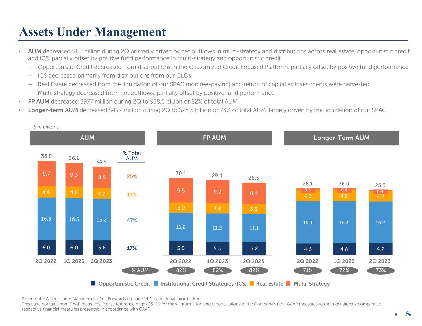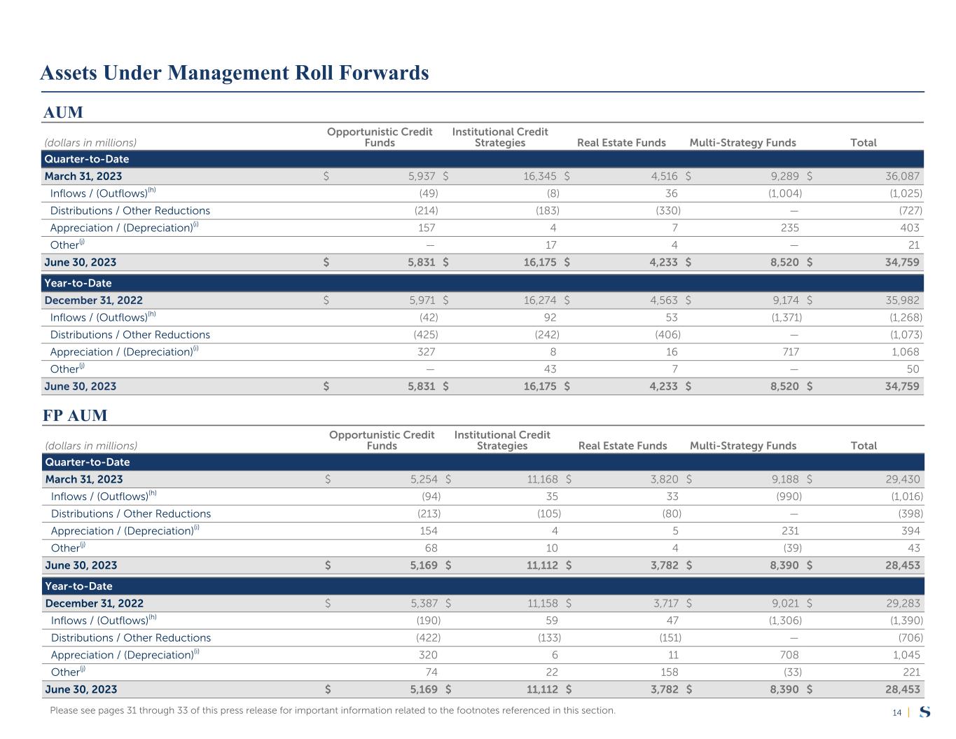 |14 (dollars in millions) Opportunistic Credit Funds Institutional Credit Strategies Real Estate Funds Multi-Strategy Funds Total Quarter-to-Date March 31, 2023 $ 5,254 $ 11,168 $ 3,820 $ 9,188 $ 29,430 Inflows / (Outflows)(h) (94) 35 33 (990) (1,016) Distributions / Other Reductions (213) (105) (80) — (398) Appreciation / (Depreciation)(i) 154 4 5 231 394 Other(j) 68 10 4 (39) 43 June 30, 2023 $ 5,169 $ 11,112 $ 3,782 $ 8,390 $ 28,453 Year-to-Date December 31, 2022 $ 5,387 $ 11,158 $ 3,717 $ 9,021 $ 29,283 Inflows / (Outflows)(h) (190) 59 47 (1,306) (1,390) Distributions / Other Reductions (422) (133) (151) — (706) Appreciation / (Depreciation)(i) 320 6 11 708 1,045 Other(j) 74 22 158 (33) 221 June 30, 2023 $ 5,169 $ 11,112 $ 3,782 $ 8,390 $ 28,453 AUM (dollars in millions) Opportunistic Credit Funds Institutional Credit Strategies Real Estate Funds Multi-Strategy Funds Total Quarter-to-Date March 31, 2023 $ 5,937 $ 16,345 $ 4,516 $ 9,289 $ 36,087 Inflows / (Outflows)(h) (49) (8) 36 (1,004) (1,025) Distributions / Other Reductions (214) (183) (330) — (727) Appreciation / (Depreciation)(i) 157 4 7 235 403 Other(j) — 17 4 — 21 June 30, 2023 $ 5,831 $ 16,175 $ 4,233 $ 8,520 $ 34,759 Year-to-Date December 31, 2022 $ 5,971 $ 16,274 $ 4,563 $ 9,174 $ 35,982 Inflows / (Outflows)(h) (42) 92 53 (1,371) (1,268) Distributions / Other Reductions (425) (242) (406) — (1,073) Appreciation / (Depreciation)(i) 327 8 16 717 1,068 Other(j) — 43 7 — 50 June 30, 2023 $ 5,831 $ 16,175 $ 4,233 $ 8,520 $ 34,759 Please see pages 31 through 33 of this press release for important information related to the footnotes referenced in this section. Assets Under Management Roll Forwards FP AUM
