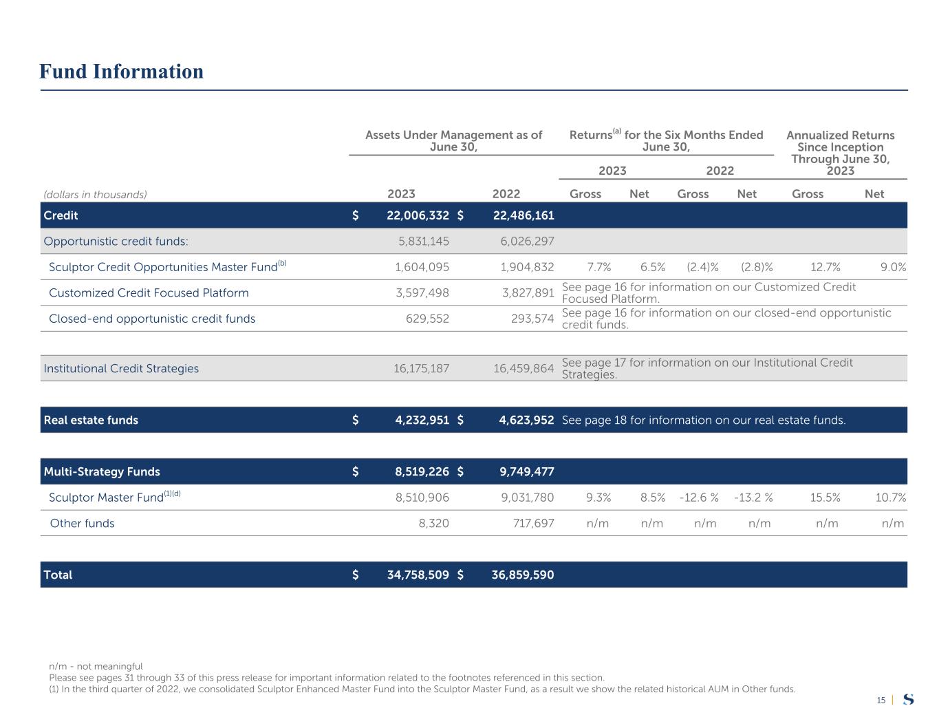 |15 Assets Under Management as of June 30, Returns(a) for the Six Months Ended June 30, Annualized Returns Since Inception Through June 30, 20232023 2022 (dollars in thousands) 2023 2022 Gross Net Gross Net Gross Net Credit $ 22,006,332 $ 22,486,161 Opportunistic credit funds: 5,831,145 6,026,297 Sculptor Credit Opportunities Master Fund(b) 1,604,095 1,904,832 7.7 % 6.5 % (2.4) % (2.8) % 12.7 % 9.0 % Customized Credit Focused Platform 3,597,498 3,827,891 See page 16 for information on our Customized Credit Focused Platform. Closed-end opportunistic credit funds 629,552 293,574 See page 16 for information on our closed-end opportunistic credit funds. Institutional Credit Strategies 16,175,187 16,459,864 See page 17 for information on our Institutional Credit Strategies. Real estate funds $ 4,232,951 $ 4,623,952 See page 18 for information on our real estate funds. Multi-Strategy Funds $ 8,519,226 $ 9,749,477 Sculptor Master Fund(1)(d) 8,510,906 9,031,780 9.3 % 8.5 % -12.6 % -13.2 % 15.5 % 10.7 % Other funds 8,320 717,697 n/m n/m n/m n/m n/m n/m Total $ 34,758,509 $ 36,859,590 n/m - not meaningful Please see pages 31 through 33 of this press release for important information related to the footnotes referenced in this section. (1) In the third quarter of 2022, we consolidated Sculptor Enhanced Master Fund into the Sculptor Master Fund, as a result we show the related historical AUM in Other funds. Fund Information
