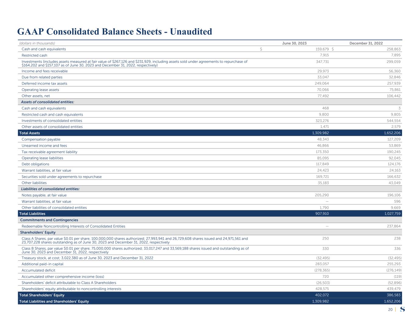 |20 (dollars in thousands) June 30, 2023 December 31, 2022 Cash and cash equivalents $ 159,679 $ 258,863 Restricted cash 7,915 7,895 Investments (includes assets measured at fair value of $267,126 and $231,929, including assets sold under agreements to repurchase of $164,202 and $157,107 as of June 30, 2023 and December 31, 2022, respectively) 347,731 299,059 Income and fees receivable 29,973 56,360 Due from related parties 33,047 32,846 Deferred income tax assets 249,064 257,939 Operating lease assets 70,066 75,861 Other assets, net 77,492 106,442 Assets of consolidated entities: Cash and cash equivalents 468 3 Restricted cash and cash equivalents 9,800 9,805 Investments of consolidated entities 323,276 544,554 Other assets of consolidated entities 1,471 2,579 Total Assets 1,309,982 1,652,206 Compensation payable 48,343 127,209 Unearned income and fees 46,866 53,869 Tax receivable agreement liability 173,350 190,245 Operating lease liabilities 85,095 92,045 Debt obligations 117,849 124,176 Warrant liabilities, at fair value 24,423 24,163 Securities sold under agreements to repurchase 169,721 166,632 Other liabilities 35,183 43,049 Liabilities of consolidated entities: Notes payable, at fair value 205,290 196,106 Warrant liabilities, at fair value — 596 Other liabilities of consolidated entities 1,790 9,669 Total Liabilities 907,910 1,027,759 Commitments and Contingencies Redeemable Noncontrolling Interests of Consolidated Entities — 237,864 Shareholders’ Equity Class A Shares, par value $0.01 per share, 100,000,000 shares authorized; 27,993,941 and 26,729,608 shares issued and 24,971,561 and 23,707,228 shares outstanding as of June 30, 2023 and December 31, 2022, respectively 250 238 Class B Shares, par value $0.01 per share, 75,000,000 shares authorized; 33,017,247 and 33,569,188 shares issued and outstanding as of June 30, 2023 and December 31, 2022, respectively 330 336 Treasury stock, at cost; 3,022,380 as of June 30, 2023 and December 31, 2022 (32,495) (32,495) Additional paid-in capital 283,057 255,293 Accumulated deficit (278,365) (276,149) Accumulated other comprehensive income (loss) 720 (119) Shareholders’ deficit attributable to Class A Shareholders (26,503) (52,896) Shareholders’ equity attributable to noncontrolling interests 428,575 439,479 Total Shareholders’ Equity 402,072 386,583 Total Liabilities and Shareholders’ Equity 1,309,982 1,652,206 GAAP Consolidated Balance Sheets - Unaudited