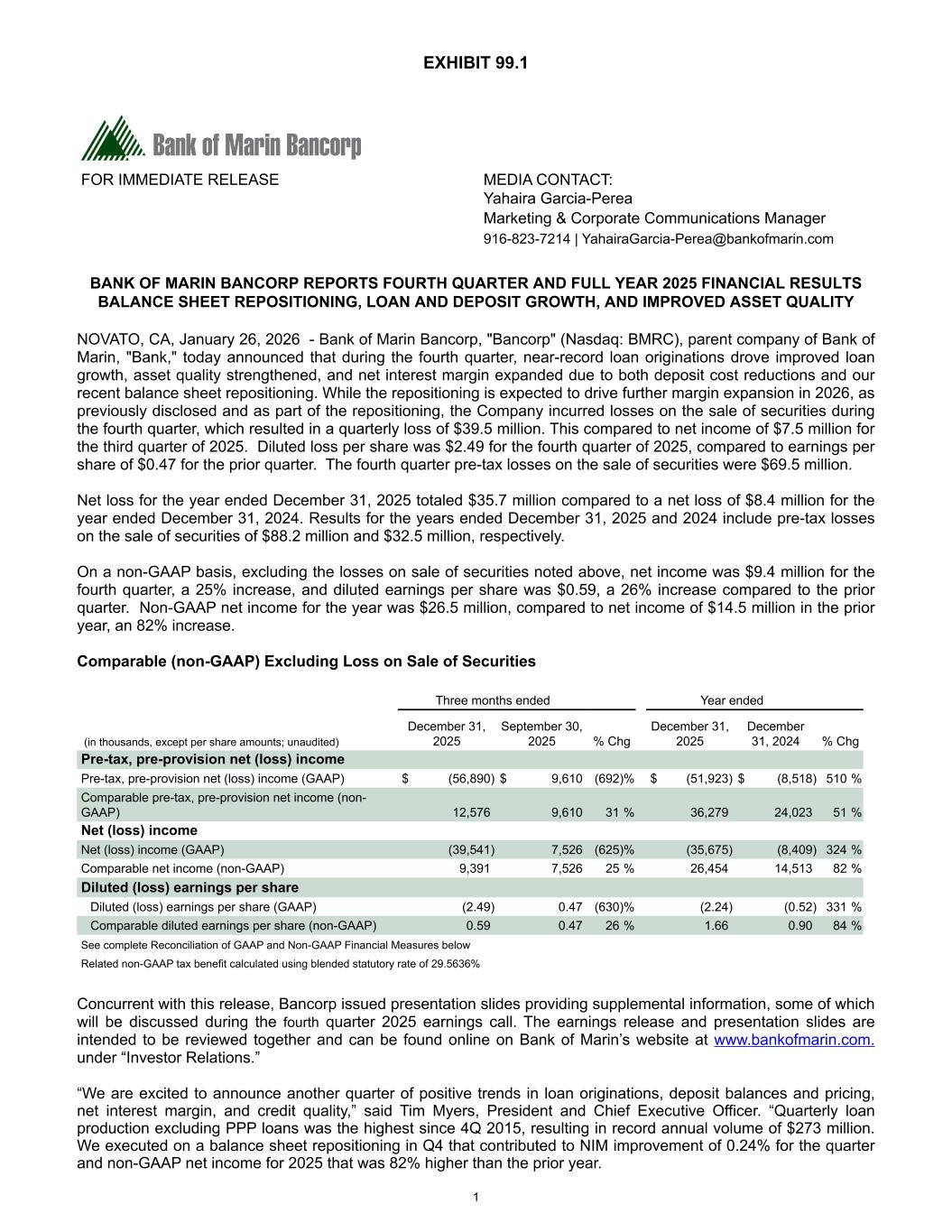 FOR IMMEDIATE RELEASE MEDIA CONTACT: Yahaira Garcia-Perea Marketing & Corporate Communications Manager 916-823-7214 | YahairaGarcia-Perea@bankofmarin.com BANK OF MARIN BANCORP REPORTS FOURTH QUARTER AND FULL YEAR 2025 FINANCIAL RESULTS BALANCE SHEET REPOSITIONING, LOAN AND DEPOSIT GROWTH, AND IMPROVED ASSET QUALITY NOVATO, CA, January 26, 2026 - Bank of Marin Bancorp, "Bancorp" (Nasdaq: BMRC), parent company of Bank of Marin, "Bank," today announced that during the fourth quarter, near-record loan originations drove improved loan growth, asset quality strengthened, and net interest margin expanded due to both deposit cost reductions and our recent balance sheet repositioning. While the repositioning is expected to drive further margin expansion in 2026, as previously disclosed and as part of the repositioning, the Company incurred losses on the sale of securities during the fourth quarter, which resulted in a quarterly loss of $39.5 million. This compared to net income of $7.5 million for the third quarter of 2025. Diluted loss per share was $2.49 for the fourth quarter of 2025, compared to earnings per share of $0.47 for the prior quarter. The fourth quarter pre-tax losses on the sale of securities were $69.5 million. Net loss for the year ended December 31, 2025 totaled $35.7 million compared to a net loss of $8.4 million for the year ended December 31, 2024. Results for the years ended December 31, 2025 and 2024 include pre-tax losses on the sale of securities of $88.2 million and $32.5 million, respectively. On a non-GAAP basis, excluding the losses on sale of securities noted above, net income was $9.4 million for the fourth quarter, a 25% increase, and diluted earnings per share was $0.59, a 26% increase compared to the prior quarter. Non-GAAP net income for the year was $26.5 million, compared to net income of $14.5 million in the prior year, an 82% increase. Comparable (non-GAAP) Excluding Loss on Sale of Securities Three months ended Year ended (in thousands, except per share amounts; unaudited) December 31, 2025 September 30, 2025 % Chg December 31, 2025 December 31, 2024 % Chg Pre-tax, pre-provision net (loss) income Pre-tax, pre-provision net (loss) income (GAAP) $ (56,890) $ 9,610 (692) % $ (51,923) $ (8,518) 510 % Comparable pre-tax, pre-provision net income (non- GAAP) 12,576 9,610 31 % 36,279 24,023 51 % Net (loss) income Net (loss) income (GAAP) (39,541) 7,526 (625) % (35,675) (8,409) 324 % Comparable net income (non-GAAP) 9,391 7,526 25 % 26,454 14,513 82 % Diluted (loss) earnings per share Diluted (loss) earnings per share (GAAP) (2.49) 0.47 (630) % (2.24) (0.52) 331 % Comparable diluted earnings per share (non-GAAP) 0.59 0.47 26 % 1.66 0.90 84 % See complete Reconciliation of GAAP and Non-GAAP Financial Measures below Related non-GAAP tax benefit calculated using blended statutory rate of 29.5636% Concurrent with this release, Bancorp issued presentation slides providing supplemental information, some of which will be discussed during the fourth quarter 2025 earnings call. The earnings release and presentation slides are intended to be reviewed together and can be found online on Bank of Marin’s website at www.bankofmarin.com. under “Investor Relations.” “We are excited to announce another quarter of positive trends in loan originations, deposit balances and pricing, net interest margin, and credit quality,” said Tim Myers, President and Chief Executive Officer. “Quarterly loan production excluding PPP loans was the highest since 4Q 2015, resulting in record annual volume of $273 million. We executed on a balance sheet repositioning in Q4 that contributed to NIM improvement of 0.24% for the quarter and non-GAAP net income for 2025 that was 82% higher than the prior year. 1
