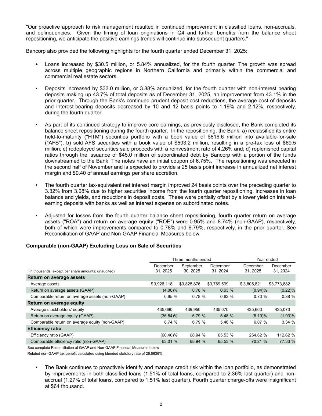 "Our proactive approach to risk management resulted in continued improvement in classified loans, non-accruals, and delinquencies. Given the timing of loan originations in Q4 and further benefits from the balance sheet repositioning, we anticipate the positive earnings trends will continue into subsequent quarters." Bancorp also provided the following highlights for the fourth quarter ended December 31, 2025: • Loans increased by $30.5 million, or 5.84% annualized, for the fourth quarter. The growth was spread across multiple geographic regions in Northern California and primarily within the commercial and commercial real estate sectors. • Deposits increased by $33.0 million, or 3.88% annualized, for the fourth quarter with non-interest bearing deposits making up 43.7% of total deposits as of December 31, 2025, an improvement from 43.1% in the prior quarter. Through the Bank's continued prudent deposit cost reductions, the average cost of deposits and interest-bearing deposits decreased by 10 and 12 basis points to 1.19% and 2.12%, respectively, during the fourth quarter. • As part of its continued strategy to improve core earnings, as previously disclosed, the Bank completed its balance sheet repositioning during the fourth quarter. In the repositioning, the Bank: a) reclassified its entire held-to-maturity ("HTM") securities portfolio with a book value of $816.6 million into available-for-sale ("AFS"); b) sold AFS securities with a book value of $593.2 million, resulting in a pre-tax loss of $69.5 million; c) redeployed securities sale proceeds with a reinvestment rate of 4.26% and; d) replenished capital ratios through the issuance of $45.0 million of subordinated debt by Bancorp with a portion of the funds downstreamed to the Bank. The notes have an initial coupon of 6.75%. The repositioning was executed in the second half of November and is expected to provide a 25 basis point increase in annualized net interest margin and $0.40 of annual earnings per share accretion. • The fourth quarter tax-equivalent net interest margin improved 24 basis points over the preceding quarter to 3.32% from 3.08% due to higher securities income from the fourth quarter repositioning, increases in loan balance and yields, and reductions in deposit costs. These were partially offset by a lower yield on interest- earning deposits with banks as well as interest expense on subordinated notes. • Adjusted for losses from the fourth quarter balance sheet repositioning, fourth quarter return on average assets ("ROA") and return on average equity ("ROE") were 0.95% and 8.74% (non-GAAP), respectively, both of which were improvements compared to 0.78% and 6.79%, respectively, in the prior quarter. See Reconciliation of GAAP and Non-GAAP Financial Measures below. Comparable (non-GAAP) Excluding Loss on Sale of Securities Three months ended Year ended (in thousands, except per share amounts; unaudited) December 31, 2025 September 30, 2025 December 31, 2024 December 31, 2025 December 31, 2024 Return on average assets Average assets $ 3,926,118 $ 3,828,876 $ 3,769,599 $ 3,805,821 $ 3,773,882 Return on average assets (GAAP) (4.00) % 0.78 % 0.63 % (0.94) % (0.22) % Comparable return on average assets (non-GAAP) 0.95 % 0.78 % 0.63 % 0.70 % 0.38 % Return on average equity Average stockholders' equity 435,660 439,950 435,070 435,660 435,070 Return on average equity (GAAP) (36.54) % 6.79 % 5.48 % (8.19) % (1.93) % Comparable return on average equity (non-GAAP) 8.74 % 6.79 % 5.48 % 6.07 % 3.34 % Efficiency ratio Efficiency ratio (GAAP) (60.40) % 68.94 % 65.53 % 254.62 % 112.62 % Comparable efficiency ratio (non-GAAP) 63.01 % 68.94 % 65.53 % 70.21 % 77.30 % See complete Reconciliation of GAAP and Non-GAAP Financial Measures below Related non-GAAP tax benefit calculated using blended statutory rate of 29.5636% • The Bank continues to proactively identify and manage credit risk within the loan portfolio, as demonstrated by improvements in both classified loans (1.51% of total loans, compared to 2.36% last quarter) and non- accrual (1.27% of total loans, compared to 1.51% last quarter). Fourth quarter charge-offs were insignificant at $64 thousand. 2