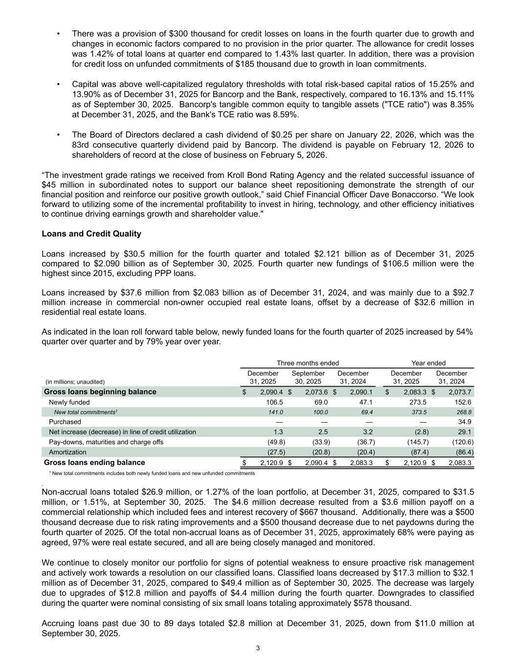 • There was a provision of $300 thousand for credit losses on loans in the fourth quarter due to growth and changes in economic factors compared to no provision in the prior quarter. The allowance for credit losses was 1.42% of total loans at quarter end compared to 1.43% last quarter. In addition, there was a provision for credit loss on unfunded commitments of $185 thousand due to growth in loan commitments. • Capital was above well-capitalized regulatory thresholds with total risk-based capital ratios of 15.25% and 13.90% as of December 31, 2025 for Bancorp and the Bank, respectively, compared to 16.13% and 15.11% as of September 30, 2025. Bancorp's tangible common equity to tangible assets ("TCE ratio") was 8.35% at December 31, 2025, and the Bank's TCE ratio was 8.59%. • The Board of Directors declared a cash dividend of $0.25 per share on January 22, 2026, which was the 83rd consecutive quarterly dividend paid by Bancorp. The dividend is payable on February 12, 2026 to shareholders of record at the close of business on February 5, 2026. “The investment grade ratings we received from Kroll Bond Rating Agency and the related successful issuance of $45 million in subordinated notes to support our balance sheet repositioning demonstrate the strength of our financial position and reinforce our positive growth outlook,” said Chief Financial Officer Dave Bonaccorso. “We look forward to utilizing some of the incremental profitability to invest in hiring, technology, and other efficiency initiatives to continue driving earnings growth and shareholder value." Loans and Credit Quality Loans increased by $30.5 million for the fourth quarter and totaled $2.121 billion as of December 31, 2025 compared to $2.090 billion as of September 30, 2025. Fourth quarter new fundings of $106.5 million were the highest since 2015, excluding PPP loans. Loans increased by $37.6 million from $2.083 billion as of December 31, 2024, and was mainly due to a $92.7 million increase in commercial non-owner occupied real estate loans, offset by a decrease of $32.6 million in residential real estate loans. As indicated in the loan roll forward table below, newly funded loans for the fourth quarter of 2025 increased by 54% quarter over quarter and by 79% year over year. Three months ended Year ended (in millions; unaudited) December 31, 2025 September 30, 2025 December 31, 2024 December 31, 2025 December 31, 2024 Gross loans beginning balance $ 2,090.4 $ 2,073.6 $ 2,090.1 $ 2,083.3 $ 2,073.7 Newly funded 106.5 69.0 47.1 273.5 152.6 New total commitments1 141.0 100.0 69.4 373.5 268.8 Purchased — — — — 34.9 Net increase (decrease) in line of credit utilization 1.3 2.5 3.2 (2.8) 29.1 Pay-downs, maturities and charge offs (49.8) (33.9) (36.7) (145.7) (120.6) Amortization (27.5) (20.8) (20.4) (87.4) (86.4) Gross loans ending balance $ 2,120.9 $ 2,090.4 $ 2,083.3 $ 2,120.9 $ 2,083.3 1 New total commitments includes both newly funded loans and new unfunded commitments . Non-accrual loans totaled $26.9 million, or 1.27% of the loan portfolio, at December 31, 2025, compared to $31.5 million, or 1.51%, at September 30, 2025. The $4.6 million decrease resulted from a $3.6 million payoff on a commercial relationship which included fees and interest recovery of $667 thousand. Additionally, there was a $500 thousand decrease due to risk rating improvements and a $500 thousand decrease due to net paydowns during the fourth quarter of 2025. Of the total non-accrual loans as of December 31, 2025, approximately 68% were paying as agreed, 97% were real estate secured, and all are being closely managed and monitored. We continue to closely monitor our portfolio for signs of potential weakness to ensure proactive risk management and actively work towards a resolution on our classified loans. Classified loans decreased by $17.3 million to $32.1 million as of December 31, 2025, compared to $49.4 million as of September 30, 2025. The decrease was largely due to upgrades of $12.8 million and payoffs of $4.4 million during the fourth quarter. Downgrades to classified during the quarter were nominal consisting of six small loans totaling approximately $578 thousand. Accruing loans past due 30 to 89 days totaled $2.8 million at December 31, 2025, down from $11.0 million at September 30, 2025. 3
