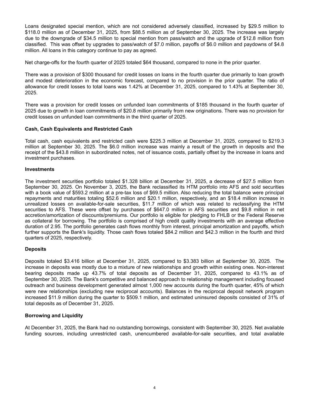 Loans designated special mention, which are not considered adversely classified, increased by $29.5 million to $118.0 million as of December 31, 2025, from $88.5 million as of September 30, 2025. The increase was largely due to the downgrade of $34.5 million to special mention from pass/watch and the upgrade of $12.8 million from classified. This was offset by upgrades to pass/watch of $7.0 million, payoffs of $6.0 million and paydowns of $4.8 million. All loans in this category continue to pay as agreed. Net charge-offs for the fourth quarter of 2025 totaled $64 thousand, compared to none in the prior quarter. There was a provision of $300 thousand for credit losses on loans in the fourth quarter due primarily to loan growth and modest deterioration in the economic forecast, compared to no provision in the prior quarter. The ratio of allowance for credit losses to total loans was 1.42% at December 31, 2025, compared to 1.43% at September 30, 2025. There was a provision for credit losses on unfunded loan commitments of $185 thousand in the fourth quarter of 2025 due to growth in loan commitments of $20.8 million primarily from new originations. There was no provision for credit losses on unfunded loan commitments in the third quarter of 2025. Cash, Cash Equivalents and Restricted Cash Total cash, cash equivalents and restricted cash were $225.3 million at December 31, 2025, compared to $219.3 million at September 30, 2025. The $6.0 million increase was mainly a result of the growth in deposits and the receipt of the $43.8 million in subordinated notes, net of issuance costs, partially offset by the increase in loans and investment purchases. Investments The investment securities portfolio totaled $1.328 billion at December 31, 2025, a decrease of $27.5 million from September 30, 2025. On November 3, 2025, the Bank reclassified its HTM portfolio into AFS and sold securities with a book value of $593.2 million at a pre-tax loss of $69.5 million. Also reducing the total balance were principal repayments and maturities totaling $52.6 million and $20.1 million, respectively, and an $18.4 million increase in unrealized losses on available-for-sale securities, $11.7 million of which was related to reclassifying the HTM securities to AFS. These were offset by purchases of $647.0 million in AFS securities and $9.8 million in net accretion/amortization of discounts/premiums. Our portfolio is eligible for pledging to FHLB or the Federal Reserve as collateral for borrowing. The portfolio is comprised of high credit quality investments with an average effective duration of 2.95. The portfolio generates cash flows monthly from interest, principal amortization and payoffs, which further supports the Bank's liquidity. Those cash flows totaled $84.2 million and $42.3 million in the fourth and third quarters of 2025, respectively. Deposits Deposits totaled $3.416 billion at December 31, 2025, compared to $3.383 billion at September 30, 2025. The increase in deposits was mostly due to a mixture of new relationships and growth within existing ones. Non-interest bearing deposits made up 43.7% of total deposits as of December 31, 2025, compared to 43.1% as of September 30, 2025. The Bank's competitive and balanced approach to relationship management including focused outreach and business development generated almost 1,000 new accounts during the fourth quarter, 45% of which were new relationships (excluding new reciprocal accounts). Balances in the reciprocal deposit network program increased $11.9 million during the quarter to $509.1 million, and estimated uninsured deposits consisted of 31% of total deposits as of December 31, 2025. Borrowing and Liquidity At December 31, 2025, the Bank had no outstanding borrowings, consistent with September 30, 2025. Net available funding sources, including unrestricted cash, unencumbered available-for-sale securities, and total available 4