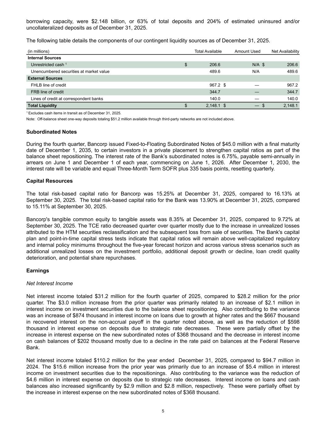 borrowing capacity, were $2.148 billion, or 63% of total deposits and 204% of estimated uninsured and/or uncollateralized deposits as of December 31, 2025. The following table details the components of our contingent liquidity sources as of December 31, 2025. (in millions) Total Available Amount Used Net Availability Internal Sources Unrestricted cash 1 $ 206.6 N/A $ 206.6 Unencumbered securities at market value 489.6 N/A 489.6 External Sources FHLB line of credit 967.2 $ — 967.2 FRB line of credit 344.7 — 344.7 Lines of credit at correspondent banks 140.0 — 140.0 Total Liquidity $ 2,148.1 $ — $ 2,148.1 1 Excludes cash items in transit as of December 31, 2025. Note: Off-balance sheet one-way deposits totaling $51.2 million available through third-party networks are not included above. Subordinated Notes During the fourth quarter, Bancorp issued Fixed-to-Floating Subordinated Notes of $45.0 million with a final maturity date of December 1, 2035, to certain investors in a private placement to strengthen capital ratios as part of the balance sheet repositioning. The interest rate of the Bank’s subordinated notes is 6.75%, payable semi-annually in arrears on June 1 and December 1 of each year, commencing on June 1, 2026. After December 1, 2030, the interest rate will be variable and equal Three-Month Term SOFR plus 335 basis points, resetting quarterly. Capital Resources The total risk-based capital ratio for Bancorp was 15.25% at December 31, 2025, compared to 16.13% at September 30, 2025. The total risk-based capital ratio for the Bank was 13.90% at December 31, 2025, compared to 15.11% at September 30, 2025. Bancorp's tangible common equity to tangible assets was 8.35% at December 31, 2025, compared to 9.72% at September 30, 2025. The TCE ratio decreased quarter over quarter mostly due to the increase in unrealized losses attributed to the HTM securities reclassification and the subsequent loss from sale of securities. The Bank's capital plan and point-in-time capital stress tests indicate that capital ratios will remain above well-capitalized regulatory and internal policy minimums throughout the five-year forecast horizon and across various stress scenarios such as additional unrealized losses on the investment portfolio, additional deposit growth or decline, loan credit quality deterioration, and potential share repurchases. Earnings Net Interest Income Net interest income totaled $31.2 million for the fourth quarter of 2025, compared to $28.2 million for the prior quarter. The $3.0 million increase from the prior quarter was primarily related to an increase of $2.1 million in interest income on investment securities due to the balance sheet repositioning. Also contributing to the variance was an increase of $874 thousand in interest income on loans due to growth at higher rates and the $667 thousand in recovered interest on the non-accrual payoff in the quarter noted above, as well as the reduction of $598 thousand in interest expense on deposits due to strategic rate decreases. These were partially offset by the increase in interest expense on the new subordinated notes of $368 thousand and the decrease in interest income on cash balances of $202 thousand mostly due to a decline in the rate paid on balances at the Federal Reserve Bank. Net interest income totaled $110.2 million for the year ended December 31, 2025, compared to $94.7 million in 2024. The $15.6 million increase from the prior year was primarily due to an increase of $5.4 million in interest income on investment securities due to the repositionings. Also contributing to the variance was the reduction of $4.6 million in interest expense on deposits due to strategic rate decreases. Interest income on loans and cash balances also increased significantly by $2.9 million and $2.8 million, respectively. These were partially offset by the increase in interest expense on the new subordinated notes of $368 thousand. 5