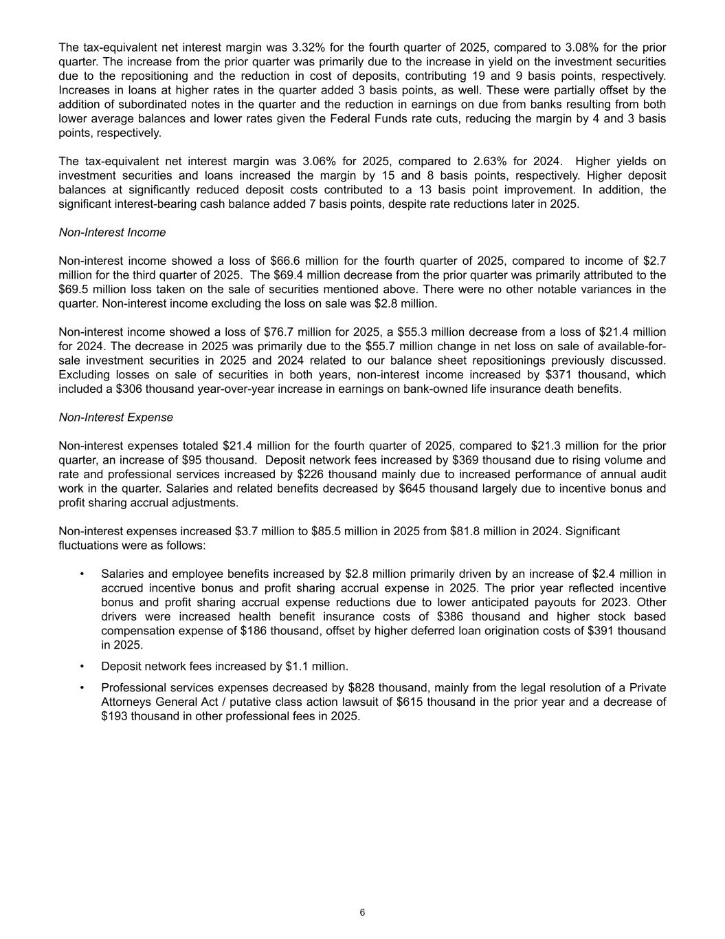 The tax-equivalent net interest margin was 3.32% for the fourth quarter of 2025, compared to 3.08% for the prior quarter. The increase from the prior quarter was primarily due to the increase in yield on the investment securities due to the repositioning and the reduction in cost of deposits, contributing 19 and 9 basis points, respectively. Increases in loans at higher rates in the quarter added 3 basis points, as well. These were partially offset by the addition of subordinated notes in the quarter and the reduction in earnings on due from banks resulting from both lower average balances and lower rates given the Federal Funds rate cuts, reducing the margin by 4 and 3 basis points, respectively. The tax-equivalent net interest margin was 3.06% for 2025, compared to 2.63% for 2024. Higher yields on investment securities and loans increased the margin by 15 and 8 basis points, respectively. Higher deposit balances at significantly reduced deposit costs contributed to a 13 basis point improvement. In addition, the significant interest-bearing cash balance added 7 basis points, despite rate reductions later in 2025. Non-Interest Income Non-interest income showed a loss of $66.6 million for the fourth quarter of 2025, compared to income of $2.7 million for the third quarter of 2025. The $69.4 million decrease from the prior quarter was primarily attributed to the $69.5 million loss taken on the sale of securities mentioned above. There were no other notable variances in the quarter. Non-interest income excluding the loss on sale was $2.8 million. Non-interest income showed a loss of $76.7 million for 2025, a $55.3 million decrease from a loss of $21.4 million for 2024. The decrease in 2025 was primarily due to the $55.7 million change in net loss on sale of available-for- sale investment securities in 2025 and 2024 related to our balance sheet repositionings previously discussed. Excluding losses on sale of securities in both years, non-interest income increased by $371 thousand, which included a $306 thousand year-over-year increase in earnings on bank-owned life insurance death benefits. Non-Interest Expense Non-interest expenses totaled $21.4 million for the fourth quarter of 2025, compared to $21.3 million for the prior quarter, an increase of $95 thousand. Deposit network fees increased by $369 thousand due to rising volume and rate and professional services increased by $226 thousand mainly due to increased performance of annual audit work in the quarter. Salaries and related benefits decreased by $645 thousand largely due to incentive bonus and profit sharing accrual adjustments. Non-interest expenses increased $3.7 million to $85.5 million in 2025 from $81.8 million in 2024. Significant fluctuations were as follows: • Salaries and employee benefits increased by $2.8 million primarily driven by an increase of $2.4 million in accrued incentive bonus and profit sharing accrual expense in 2025. The prior year reflected incentive bonus and profit sharing accrual expense reductions due to lower anticipated payouts for 2023. Other drivers were increased health benefit insurance costs of $386 thousand and higher stock based compensation expense of $186 thousand, offset by higher deferred loan origination costs of $391 thousand in 2025. • Deposit network fees increased by $1.1 million. • Professional services expenses decreased by $828 thousand, mainly from the legal resolution of a Private Attorneys General Act / putative class action lawsuit of $615 thousand in the prior year and a decrease of $193 thousand in other professional fees in 2025. 6
