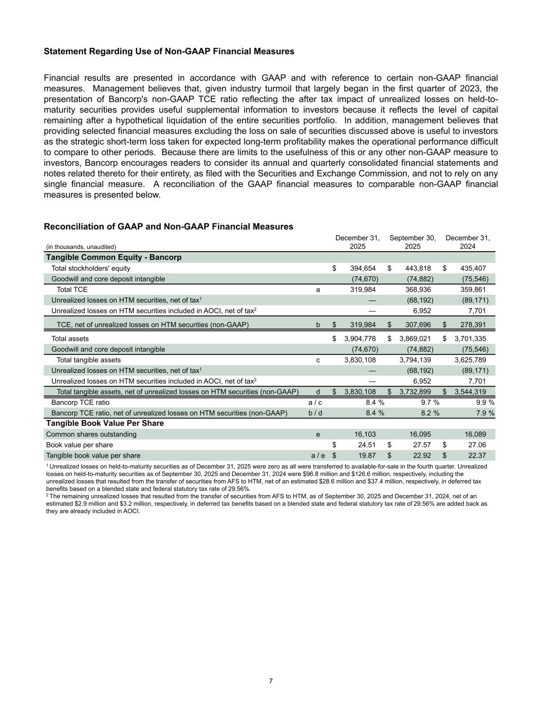 Statement Regarding Use of Non-GAAP Financial Measures Financial results are presented in accordance with GAAP and with reference to certain non-GAAP financial measures. Management believes that, given industry turmoil that largely began in the first quarter of 2023, the presentation of Bancorp's non-GAAP TCE ratio reflecting the after tax impact of unrealized losses on held-to- maturity securities provides useful supplemental information to investors because it reflects the level of capital remaining after a hypothetical liquidation of the entire securities portfolio. In addition, management believes that providing selected financial measures excluding the loss on sale of securities discussed above is useful to investors as the strategic short-term loss taken for expected long-term profitability makes the operational performance difficult to compare to other periods. Because there are limits to the usefulness of this or any other non-GAAP measure to investors, Bancorp encourages readers to consider its annual and quarterly consolidated financial statements and notes related thereto for their entirety, as filed with the Securities and Exchange Commission, and not to rely on any single financial measure. A reconciliation of the GAAP financial measures to comparable non-GAAP financial measures is presented below. Reconciliation of GAAP and Non-GAAP Financial Measures (in thousands, unaudited) December 31, 2025 September 30, 2025 December 31, 2024 Tangible Common Equity - Bancorp Total stockholders' equity $ 394,654 $ 443,818 $ 435,407 Goodwill and core deposit intangible (74,670) (74,882) (75,546) Total TCE a 319,984 368,936 359,861 Unrealized losses on HTM securities, net of tax1 — (68,192) (89,171) Unrealized losses on HTM securities included in AOCI, net of tax2 — 6,952 7,701 TCE, net of unrealized losses on HTM securities (non-GAAP) b $ 319,984 $ 307,696 $ 278,391 Total assets $ 3,904,778 $ 3,869,021 $ 3,701,335 Goodwill and core deposit intangible (74,670) (74,882) (75,546) Total tangible assets c 3,830,108 3,794,139 3,625,789 Unrealized losses on HTM securities, net of tax1 — (68,192) (89,171) Unrealized losses on HTM securities included in AOCI, net of tax2 — 6,952 7,701 Total tangible assets, net of unrealized losses on HTM securities (non-GAAP) d $ 3,830,108 $ 3,732,899 $ 3,544,319 Bancorp TCE ratio a / c 8.4 % 9.7 % 9.9 % Bancorp TCE ratio, net of unrealized losses on HTM securities (non-GAAP) b / d 8.4 % 8.2 % 7.9 % Tangible Book Value Per Share Common shares outstanding e 16,103 16,095 16,089 Book value per share $ 24.51 $ 27.57 $ 27.06 Tangible book value per share a / e $ 19.87 $ 22.92 $ 22.37 1 Unrealized losses on held-to-maturity securities as of December 31, 2025 were zero as all were transferred to available-for-sale in the fourth quarter. Unrealized losses on held-to-maturity securities as of September 30, 2025 and December 31, 2024 were $96.8 million and $126.6 million, respectively, including the unrealized losses that resulted from the transfer of securities from AFS to HTM, net of an estimated $28.6 million and $37.4 million, respectively, in deferred tax benefits based on a blended state and federal statutory tax rate of 29.56%. 2 The remaining unrealized losses that resulted from the transfer of securities from AFS to HTM, as of September 30, 2025 and December 31, 2024, net of an estimated $2.9 million and $3.2 million, respectively, in deferred tax benefits based on a blended state and federal statutory tax rate of 29.56% are added back as they are already included in AOCI. 7