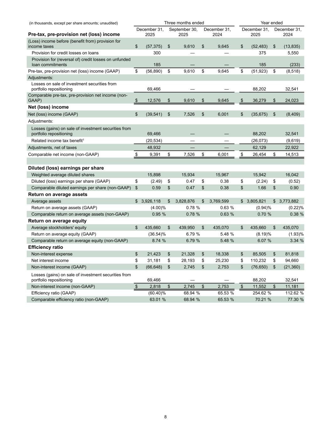 (in thousands, except per share amounts; unaudited) Three months ended Year ended Pre-tax, pre-provision net (loss) income December 31, 2025 September 30, 2025 December 31, 2024 December 31, 2025 December 31, 2024 (Loss) income before (benefit from) provision for income taxes $ (57,375) $ 9,610 $ 9,645 $ (52,483) $ (13,835) Provision for credit losses on loans 300 — — 375 5,550 Provision for (reversal of) credit losses on unfunded loan commitments 185 — — 185 (233) Pre-tax, pre-provision net (loss) income (GAAP) $ (56,890) $ 9,610 $ 9,645 $ (51,923) $ (8,518) Adjustments: Losses on sale of investment securities from portfolio repositioning 69,466 — — 88,202 32,541 Comparable pre-tax, pre-provision net income (non- GAAP) $ 12,576 $ 9,610 $ 9,645 $ 36,279 $ 24,023 Net (loss) income Net (loss) income (GAAP) $ (39,541) $ 7,526 $ 6,001 $ (35,675) $ (8,409) Adjustments: Losses (gains) on sale of investment securities from portfolio repositioning 69,466 — — 88,202 32,541 Related income tax benefit1 (20,534) — — (26,073) (9,619) Adjustments, net of taxes 48,932 — — 62,129 22,922 Comparable net income (non-GAAP) $ 9,391 $ 7,526 $ 6,001 $ 26,454 $ 14,513 Diluted (loss) earnings per share Weighted average diluted shares 15,898 15,934 15,967 15,942 16,042 Diluted (loss) earnings per share (GAAP) $ (2.49) $ 0.47 $ 0.38 $ (2.24) $ (0.52) Comparable diluted earnings per share (non-GAAP) $ 0.59 $ 0.47 $ 0.38 $ 1.66 $ 0.90 Return on average assets Average assets $ 3,926,118 $ 3,828,876 $ 3,769,599 $ 3,805,821 $ 3,773,882 Return on average assets (GAAP) (4.00) % 0.78 % 0.63 % (0.94) % (0.22) % Comparable return on average assets (non-GAAP) 0.95 % 0.78 % 0.63 % 0.70 % 0.38 % Return on average equity Average stockholders' equity $ 435,660 $ 439,950 $ 435,070 $ 435,660 $ 435,070 Return on average equity (GAAP) (36.54) % 6.79 % 5.48 % (8.19) % (1.93) % Comparable return on average equity (non-GAAP) 8.74 % 6.79 % 5.48 % 6.07 % 3.34 % Efficiency ratio Non-interest expense $ 21,423 $ 21,328 $ 18,338 $ 85,505 $ 81,818 Net interest income $ 31,181 $ 28,193 $ 25,230 $ 110,232 $ 94,660 Non-interest income (GAAP) $ (66,648) $ 2,745 $ 2,753 $ (76,650) $ (21,360) Losses (gains) on sale of investment securities from portfolio repositioning 69,466 — — 88,202 32,541 Non-interest income (non-GAAP) $ 2,818 $ 2,745 $ 2,753 $ 11,552 $ 11,181 Efficiency ratio (GAAP) (60.40) % 68.94 % 65.53 % 254.62 % 112.62 % Comparable efficiency ratio (non-GAAP) 63.01 % 68.94 % 65.53 % 70.21 % 77.30 % 8