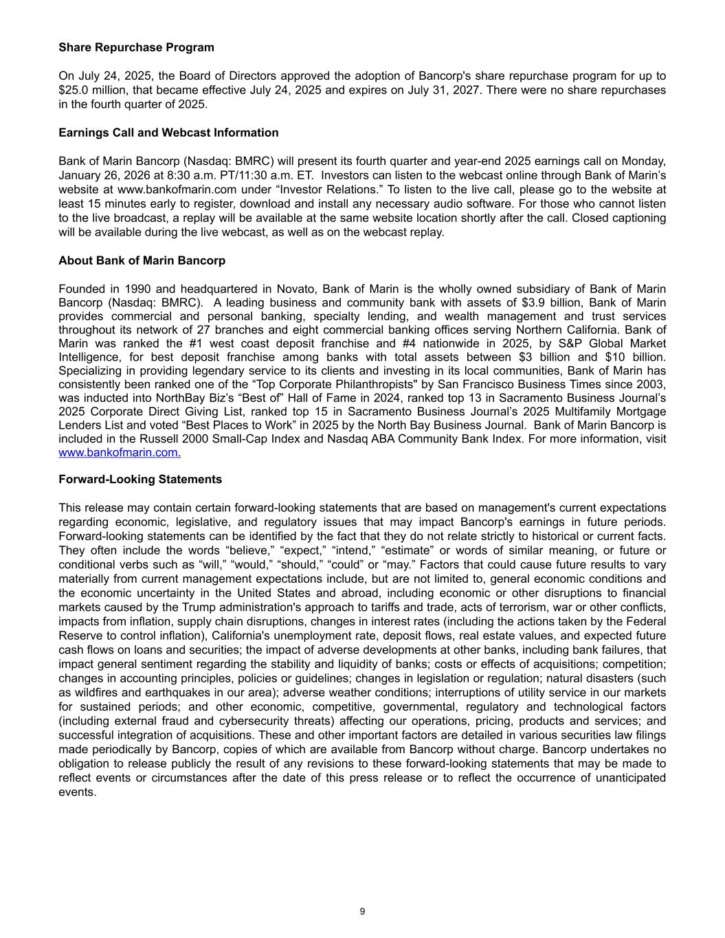 Share Repurchase Program On July 24, 2025, the Board of Directors approved the adoption of Bancorp's share repurchase program for up to $25.0 million, that became effective July 24, 2025 and expires on July 31, 2027. There were no share repurchases in the fourth quarter of 2025. Earnings Call and Webcast Information Bank of Marin Bancorp (Nasdaq: BMRC) will present its fourth quarter and year-end 2025 earnings call on Monday, January 26, 2026 at 8:30 a.m. PT/11:30 a.m. ET. Investors can listen to the webcast online through Bank of Marin’s website at www.bankofmarin.com under “Investor Relations.” To listen to the live call, please go to the website at least 15 minutes early to register, download and install any necessary audio software. For those who cannot listen to the live broadcast, a replay will be available at the same website location shortly after the call. Closed captioning will be available during the live webcast, as well as on the webcast replay. About Bank of Marin Bancorp Founded in 1990 and headquartered in Novato, Bank of Marin is the wholly owned subsidiary of Bank of Marin Bancorp (Nasdaq: BMRC). A leading business and community bank with assets of $3.9 billion, Bank of Marin provides commercial and personal banking, specialty lending, and wealth management and trust services throughout its network of 27 branches and eight commercial banking offices serving Northern California. Bank of Marin was ranked the #1 west coast deposit franchise and #4 nationwide in 2025, by S&P Global Market Intelligence, for best deposit franchise among banks with total assets between $3 billion and $10 billion. Specializing in providing legendary service to its clients and investing in its local communities, Bank of Marin has consistently been ranked one of the “Top Corporate Philanthropists" by San Francisco Business Times since 2003, was inducted into NorthBay Biz’s “Best of” Hall of Fame in 2024, ranked top 13 in Sacramento Business Journal’s 2025 Corporate Direct Giving List, ranked top 15 in Sacramento Business Journal’s 2025 Multifamily Mortgage Lenders List and voted “Best Places to Work” in 2025 by the North Bay Business Journal. Bank of Marin Bancorp is included in the Russell 2000 Small-Cap Index and Nasdaq ABA Community Bank Index. For more information, visit www.bankofmarin.com. Forward-Looking Statements This release may contain certain forward-looking statements that are based on management's current expectations regarding economic, legislative, and regulatory issues that may impact Bancorp's earnings in future periods. Forward-looking statements can be identified by the fact that they do not relate strictly to historical or current facts. They often include the words “believe,” “expect,” “intend,” “estimate” or words of similar meaning, or future or conditional verbs such as “will,” “would,” “should,” “could” or “may.” Factors that could cause future results to vary materially from current management expectations include, but are not limited to, general economic conditions and the economic uncertainty in the United States and abroad, including economic or other disruptions to financial markets caused by the Trump administration's approach to tariffs and trade, acts of terrorism, war or other conflicts, impacts from inflation, supply chain disruptions, changes in interest rates (including the actions taken by the Federal Reserve to control inflation), California's unemployment rate, deposit flows, real estate values, and expected future cash flows on loans and securities; the impact of adverse developments at other banks, including bank failures, that impact general sentiment regarding the stability and liquidity of banks; costs or effects of acquisitions; competition; changes in accounting principles, policies or guidelines; changes in legislation or regulation; natural disasters (such as wildfires and earthquakes in our area); adverse weather conditions; interruptions of utility service in our markets for sustained periods; and other economic, competitive, governmental, regulatory and technological factors (including external fraud and cybersecurity threats) affecting our operations, pricing, products and services; and successful integration of acquisitions. These and other important factors are detailed in various securities law filings made periodically by Bancorp, copies of which are available from Bancorp without charge. Bancorp undertakes no obligation to release publicly the result of any revisions to these forward-looking statements that may be made to reflect events or circumstances after the date of this press release or to reflect the occurrence of unanticipated events. 9