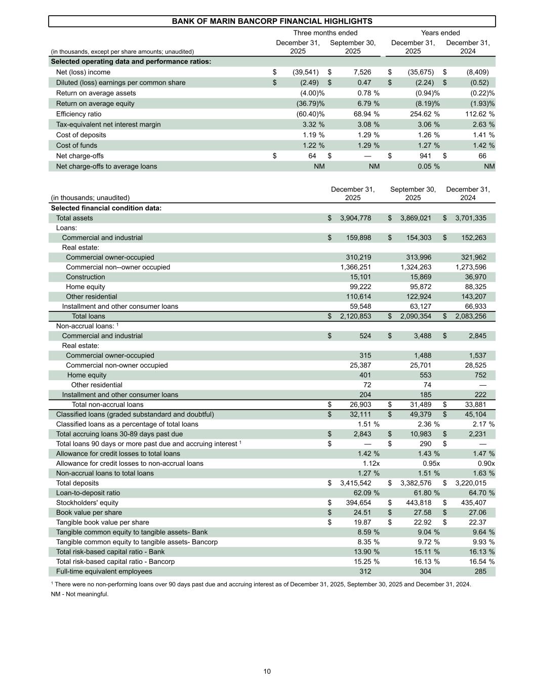 BANK OF MARIN BANCORP FINANCIAL HIGHLIGHTS Three months ended Years ended (in thousands, except per share amounts; unaudited) December 31, 2025 September 30, 2025 December 31, 2025 December 31, 2024 Selected operating data and performance ratios: Net (loss) income $ (39,541) $ 7,526 $ (35,675) $ (8,409) Diluted (loss) earnings per common share $ (2.49) $ 0.47 $ (2.24) $ (0.52) Return on average assets (4.00) % 0.78 % (0.94) % (0.22) % Return on average equity (36.79) % 6.79 % (8.19) % (1.93) % Efficiency ratio (60.40) % 68.94 % 254.62 % 112.62 % Tax-equivalent net interest margin 3.32 % 3.08 % 3.06 % 2.63 % Cost of deposits 1.19 % 1.29 % 1.26 % 1.41 % Cost of funds 1.22 % 1.29 % 1.27 % 1.42 % Net charge-offs $ 64 $ — $ 941 $ 66 Net charge-offs to average loans NM NM 0.05 % NM (in thousands; unaudited) December 31, 2025 September 30, 2025 December 31, 2024 Selected financial condition data: Total assets $ 3,904,778 $ 3,869,021 $ 3,701,335 Loans: Commercial and industrial $ 159,898 $ 154,303 $ 152,263 Real estate: Commercial owner-occupied 310,219 313,996 321,962 Commercial non--owner occupied 1,366,251 1,324,263 1,273,596 Construction 15,101 15,869 36,970 Home equity 99,222 95,872 88,325 Other residential 110,614 122,924 143,207 Installment and other consumer loans 59,548 63,127 66,933 Total loans $ 2,120,853 $ 2,090,354 $ 2,083,256 Non-accrual loans: 1 Commercial and industrial $ 524 $ 3,488 $ 2,845 Real estate: Commercial owner-occupied 315 1,488 1,537 Commercial non-owner occupied 25,387 25,701 28,525 Home equity 401 553 752 Other residential 72 74 — Installment and other consumer loans 204 185 222 Total non-accrual loans $ 26,903 $ 31,489 $ 33,881 Classified loans (graded substandard and doubtful) $ 32,111 $ 49,379 $ 45,104 Classified loans as a percentage of total loans 1.51 % 2.36 % 2.17 % Total accruing loans 30-89 days past due $ 2,843 $ 10,983 $ 2,231 Total loans 90 days or more past due and accruing interest 1 $ — $ 290 $ — Allowance for credit losses to total loans 1.42 % 1.43 % 1.47 % Allowance for credit losses to non-accrual loans 1.12x 0.95x 0.90x Non-accrual loans to total loans 1.27 % 1.51 % 1.63 % Total deposits $ 3,415,542 $ 3,382,576 $ 3,220,015 Loan-to-deposit ratio 62.09 % 61.80 % 64.70 % Stockholders' equity $ 394,654 $ 443,818 $ 435,407 Book value per share $ 24.51 $ 27.58 $ 27.06 Tangible book value per share $ 19.87 $ 22.92 $ 22.37 Tangible common equity to tangible assets- Bank 8.59 % 9.04 % 9.64 % Tangible common equity to tangible assets- Bancorp 8.35 % 9.72 % 9.93 % Total risk-based capital ratio - Bank 13.90 % 15.11 % 16.13 % Total risk-based capital ratio - Bancorp 15.25 % 16.13 % 16.54 % Full-time equivalent employees 312 304 285 1 There were no non-performing loans over 90 days past due and accruing interest as of December 31, 2025, September 30, 2025 and December 31, 2024. NM - Not meaningful. 10
