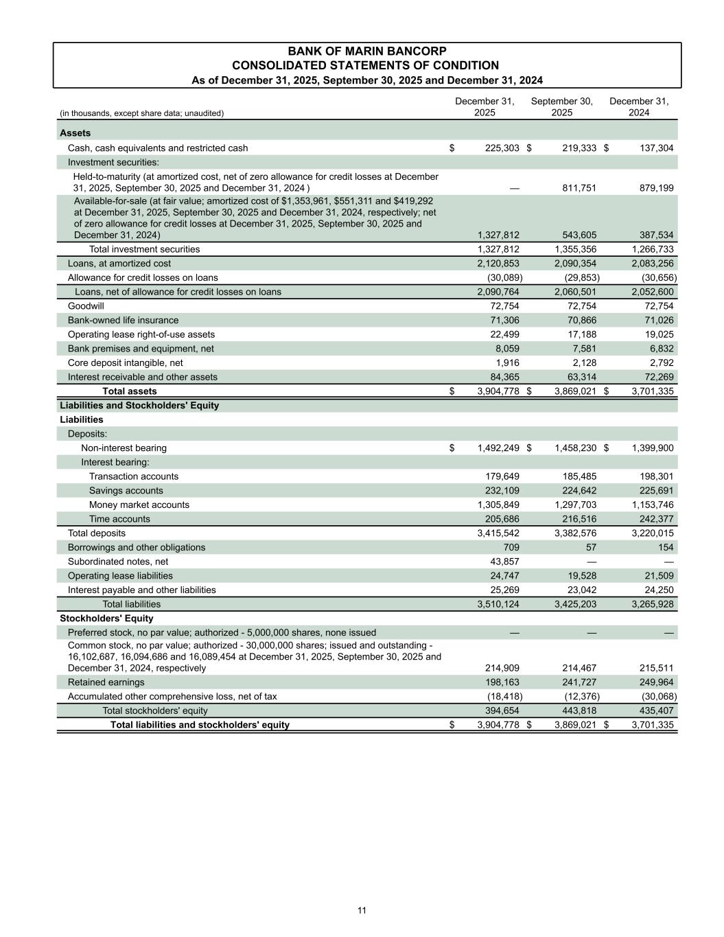 BANK OF MARIN BANCORP CONSOLIDATED STATEMENTS OF CONDITION As of December 31, 2025, September 30, 2025 and December 31, 2024 (in thousands, except share data; unaudited) December 31, 2025 September 30, 2025 December 31, 2024 Assets Cash, cash equivalents and restricted cash $ 225,303 $ 219,333 $ 137,304 Investment securities: Held-to-maturity (at amortized cost, net of zero allowance for credit losses at December 31, 2025, September 30, 2025 and December 31, 2024 ) — 811,751 879,199 Available-for-sale (at fair value; amortized cost of $1,353,961, $551,311 and $419,292 at December 31, 2025, September 30, 2025 and December 31, 2024, respectively; net of zero allowance for credit losses at December 31, 2025, September 30, 2025 and December 31, 2024) 1,327,812 543,605 387,534 Total investment securities 1,327,812 1,355,356 1,266,733 Loans, at amortized cost 2,120,853 2,090,354 2,083,256 Allowance for credit losses on loans (30,089) (29,853) (30,656) Loans, net of allowance for credit losses on loans 2,090,764 2,060,501 2,052,600 Goodwill 72,754 72,754 72,754 Bank-owned life insurance 71,306 70,866 71,026 Operating lease right-of-use assets 22,499 17,188 19,025 Bank premises and equipment, net 8,059 7,581 6,832 Core deposit intangible, net 1,916 2,128 2,792 Interest receivable and other assets 84,365 63,314 72,269 Total assets $ 3,904,778 $ 3,869,021 $ 3,701,335 Liabilities and Stockholders' Equity Liabilities Deposits: Non-interest bearing $ 1,492,249 $ 1,458,230 $ 1,399,900 Interest bearing: Transaction accounts 179,649 185,485 198,301 Savings accounts 232,109 224,642 225,691 Money market accounts 1,305,849 1,297,703 1,153,746 Time accounts 205,686 216,516 242,377 Total deposits 3,415,542 3,382,576 3,220,015 Borrowings and other obligations 709 57 154 Subordinated notes, net 43,857 — — Operating lease liabilities 24,747 19,528 21,509 Interest payable and other liabilities 25,269 23,042 24,250 Total liabilities 3,510,124 3,425,203 3,265,928 Stockholders' Equity Preferred stock, no par value; authorized - 5,000,000 shares, none issued — — — Common stock, no par value; authorized - 30,000,000 shares; issued and outstanding - 16,102,687, 16,094,686 and 16,089,454 at December 31, 2025, September 30, 2025 and December 31, 2024, respectively 214,909 214,467 215,511 Retained earnings 198,163 241,727 249,964 Accumulated other comprehensive loss, net of tax (18,418) (12,376) (30,068) Total stockholders' equity 394,654 443,818 435,407 Total liabilities and stockholders' equity $ 3,904,778 $ 3,869,021 $ 3,701,335 11