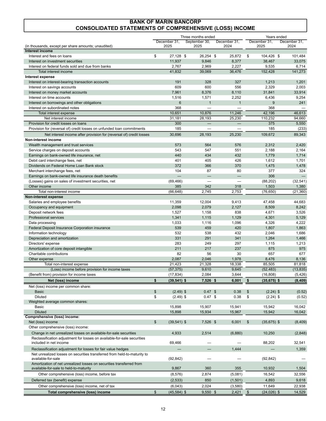 BANK OF MARIN BANCORP CONSOLIDATED STATEMENTS OF COMPREHENSIVE (LOSS) INCOME Three months ended Years ended (in thousands, except per share amounts; unaudited) December 31, 2025 September 30, 2025 December 31, 2024 December 31, 2025 December 31, 2024 Interest income Interest and fees on loans $ 27,128 $ 26,254 $ 25,872 $ 104,426 $ 101,484 Interest on investment securities 11,937 9,846 8,377 38,467 33,075 Interest on federal funds sold and due from banks 2,767 2,969 2,227 9,535 6,714 Total interest income 41,832 39,069 36,476 152,428 141,273 Interest expense Interest on interest-bearing transaction accounts 191 328 327 1,213 1,201 Interest on savings accounts 609 600 556 2,329 2,003 Interest on money market accounts 7,961 8,376 8,110 31,841 33,914 Interest on time accounts 1,516 1,571 2,252 6,436 9,254 Interest on borrowings and other obligations 6 1 1 9 241 Interest on subordinated notes 368 — — 368 — Total interest expense 10,651 10,876 11,246 42,196 46,613 Net interest income 31,181 28,193 25,230 110,232 94,660 Provision for credit losses on loans 300 — — 375 5,550 Provision for (reversal of) credit losses on unfunded loan commitments 185 — — 185 (233) Net interest income after provision for (reversal of) credit losses 30,696 28,193 25,230 109,672 89,343 Non-interest income Wealth management and trust services 573 564 576 2,312 2,420 Service charges on deposit accounts 543 547 551 2,188 2,164 Earnings on bank-owned life insurance, net 440 434 432 1,779 1,714 Debit card interchange fees, net 401 405 426 1,612 1,701 Dividends on Federal Home Loan Bank stock 372 366 370 1,475 1,478 Merchant interchange fees, net 104 87 80 377 324 Earnings on bank-owned life insurance death benefits — — — 306 — (Losses) gains on sales of investment securities, net (69,466) — — (88,202) (32,541) Other income 385 342 318 1,503 1,380 Total non-interest income (66,648) 2,745 2,753 (76,650) (21,360) Non-interest expense Salaries and employee benefits 11,359 12,004 9,413 47,458 44,683 Occupancy and equipment 2,098 2,079 2,127 8,509 8,242 Deposit network fees 1,527 1,158 838 4,671 3,526 Professional services 1,341 1,115 1,129 4,301 5,129 Data processing 1,033 1,116 1,096 4,326 4,222 Federal Deposit Insurance Corporation insurance 539 459 420 1,807 1,863 Information technology 532 538 432 2,046 1,686 Depreciation and amortization 331 291 341 1,264 1,466 Directors' expense 283 249 297 1,115 1,213 Amortization of core deposit intangible 211 217 237 875 975 Charitable contributions 82 56 30 657 677 Other expense 2,087 2,046 1,978 8,476 8,136 Total non-interest expense 21,423 21,328 18,338 85,505 81,818 (Loss) income before provision for income taxes (57,375) 9,610 9,645 (52,483) (13,835) (Benefit from) provision for income taxes (17,834) 2,084 3,644 (16,808) (5,426) Net (loss) income $ (39,541) $ 7,526 $ 6,001 $ (35,675) $ (8,409) Net (loss) income per common share: Basic $ (2.49) $ 0.47 $ 0.38 $ (2.24) $ (0.52) Diluted $ (2.49) $ 0.47 $ 0.38 $ (2.24) $ (0.52) Weighted average common shares: Basic 15,898 15,907 15,941 15,942 16,042 Diluted 15,898 15,934 15,967 15,942 16,042 Comprehensive (loss) income: Net (loss) income $ (39,541) $ 7,526 $ 6,001 $ (35,675) $ (8,409) Other comprehensive (loss) income: Change in net unrealized losses on available-for-sale securities 4,933 2,514 (6,880) 10,250 (2,848) Reclassification adjustment for losses on available-for-sale securities included in net income 69,466 — — 88,202 32,541 Reclassification adjustment for losses for fair value hedges — — 1,444 — 1,359 Net unrealized losses on securities transferred from held-to-maturity to available-for-sale (92,842) — — (92,842) — Amortization of net unrealized losses on securities transferred from available-for-sale to held-to-maturity 9,867 360 355 10,932 1,504 Other comprehensive (loss) income, before tax (8,576) 2,874 (5,081) 16,542 32,556 Deferred tax (benefit) expense (2,533) 850 (1,501) 4,893 9,618 Other comprehensive (loss) income, net of tax (6,043) 2,024 (3,580) 11,649 22,938 Total comprehensive (loss) income $ (45,584) $ 9,550 $ 2,421 $ (24,026) $ 14,529 12