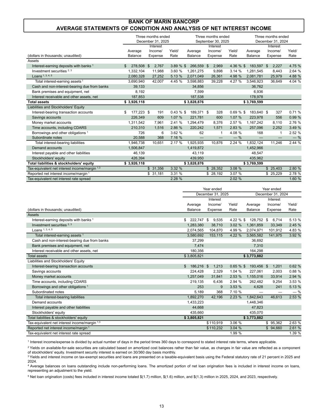 BANK OF MARIN BANCORP AVERAGE STATEMENTS OF CONDITION AND ANALYSIS OF NET INTEREST INCOME Three months ended Three months ended Three months ended December 31, 2025 September 30, 2025 December 31, 2024 Interest Interest Interest Average Income/ Yield/ Average Income/ Yield/ Average Income/ Yield/ (dollars in thousands; unaudited) Balance Expense Rate Balance Expense Rate Balance Expense Rate Assets Interest-earning deposits with banks 1 $ 278,508 $ 2,767 3.89 % $ 266,559 $ 2,969 4.36 % $ 183,597 $ 2,227 4.75 % Investment securities 2, 3 1,332,104 11,988 3.60 % 1,261,275 9,898 3.14 % 1,281,545 8,443 2.64 % Loans 1, 3, 4, 5 2,080,328 27,252 5.13 % 2,071,049 26,361 4.98 % 2,081,781 25,979 4.88 % Total interest-earning assets 1 3,690,940 42,007 4.45 % 3,598,883 39,228 4.27 % 3,546,923 36,649 4.04 % Cash and non-interest-bearing due from banks 39,133 34,856 36,762 Bank premises and equipment, net 8,192 7,599 6,936 Interest receivable and other assets, net 187,853 187,538 178,978 Total assets $ 3,926,118 $ 3,828,876 $ 3,769,599 Liabilities and Stockholders' Equity Interest-bearing transaction accounts $ 177,223 $ 191 0.43 % $ 189,371 $ 328 0.69 % $ 183,640 $ 327 0.71 % Savings accounts 226,349 609 1.07 % 221,781 600 1.07 % 223,978 556 0.99 % Money market accounts 1,311,542 7,961 2.41 % 1,294,479 8,376 2.57 % 1,167,242 8,110 2.76 % Time accounts, including CDARS 210,310 1,516 2.86 % 220,242 1,571 2.83 % 257,096 2,252 3.49 % Borrowings and other obligations 1 726 6 3.62 % 62 1 4.08 % 168 1 2.52 % Subordinate notes 20,588 368 7.16 % — — — % — — — % Total interest-bearing liabilities 1,946,738 10,651 2.17 % 1,925,935 10,876 2.24 % 1,832,124 11,246 2.44 % Demand accounts 1,506,847 1,419,872 1,452,966 Interest payable and other liabilities 46,139 43,119 48,547 Stockholders' equity 426,394 439,950 435,962 Total liabilities & stockholders' equity $ 3,926,118 $ 3,828,876 $ 3,769,599 Tax-equivalent net interest income/margin 1,3 $ 31,356 3.32 % $ 28,352 3.08 % $ 25,403 2.80 % Reported net interest income/margin 1 $ 31,181 3.31 % $ 28,192 3.07 % $ 25,229 2.78 % Tax-equivalent net interest rate spread 2.28 % 2.02 % 1.60 % Year ended Year ended December 31, 2025 December 31, 2024 Interest Interest Average Income/ Yield/ Average Income/ Yield/ (dollars in thousands; unaudited) Balance Expense Rate Balance Expense Rate Assets Interest-earning deposits with banks 1 $ 222,747 $ 9,535 4.22 % $ 128,752 $ 6,714 5.13 % Investment securities 2, 3 1,283,380 38,710 3.02 % 1,361,859 33,349 2.45 % Loans 1, 3, 4, 5 2,074,565 104,870 4.99 % 2,074,971 101,912 4.83 % Total interest-earning assets 1 3,580,692 153,115 4.22 % 3,565,582 141,975 3.92 % Cash and non-interest-bearing due from banks 37,299 36,692 Bank premises and equipment, net 7,474 7,310 Interest receivable and other assets, net 180,356 164,298 Total assets $ 3,805,821 $ 3,773,882 Liabilities and Stockholders' Equity Interest-bearing transaction accounts $ 186,216 $ 1,213 0.65 % $ 193,456 $ 1,201 0.62 % Savings accounts 224,428 2,329 1.04 % 227,061 2,003 0.88 % Money market accounts 1,257,049 31,841 2.53 % 1,155,016 33,914 2.94 % Time accounts, including CDARS 219,135 6,436 2.94 % 262,482 9,254 3.53 % Borrowings and other obligations 1 253 9 3.53 % 4,628 241 5.13 % Subordinated notes 5,189 368 7.10 % — — — % Total interest-bearing liabilities 1,892,270 42,196 2.23 % 1,842,643 46,613 2.53 % Demand accounts 1,433,223 1,448,346 Interest payable and other liabilities 44,668 47,823 Stockholders' equity 435,660 435,070 Total liabilities & stockholders' equity $ 3,805,821 $ 3,773,882 Tax-equivalent net interest income/margin 1,3 $ 110,919 3.06 % $ 95,362 2.63 % Reported net interest income/margin 1 $ 110,232 3.04 % $ 94,660 2.61 % Tax-equivalent net interest rate spread 1.99 % 1.39 % 1 Interest income/expense is divided by actual number of days in the period times 360 days to correspond to stated interest rate terms, where applicable. 2 Yields on available-for-sale securities are calculated based on amortized cost balances rather than fair value, as changes in fair value are reflected as a component of stockholders' equity. Investment security interest is earned on 30/360 day basis monthly. 3 Yields and interest income on tax-exempt securities and loans are presented on a taxable-equivalent basis using the Federal statutory rate of 21 percent in 2025 and 2024. 4 Average balances on loans outstanding include non-performing loans. The amortized portion of net loan origination fees is included in interest income on loans, representing an adjustment to the yield. 5 Net loan origination (costs) fees included in interest income totaled $(1.7) million, $(1.6) million, and $(1.3) million in 2025, 2024, and 2023, respectively. 13