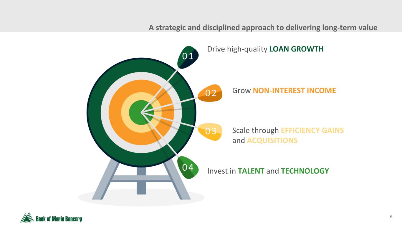 5 Text 95,96,96 Light Gray 232, 232, 232 Black 0, 0, 0 White 255, 255, 255 Accent 1 7,89,52 Accent 2 248,153,40 Accent 3 254,217,129 Accent 4 52,153,70 Accent 5 5,39,67 Accent 6 171,184,195 Bob Gotelli EVP, Human Resources Director • 31 years of human resources experience • Joined Bank of Marin in 2000 David Bloom EVP, Head of Commercial Banking • 30 years of commercial banking experience • Joined Bank of Marin in 2023 Tim Myers President and Chief Executive Officer • 27 years of finance and banking experience • Joined Bank of Marin in 2007 Brandi Campbell EVP, Head of Retail Banking • 37 years of banking experience • Joined Bank of Marin in 2019 Sathis Arasadi EVP, Chief Information Officer • 32 years of engineering, technology, and fintech experience • Joined Bank of Marin in 2023 Dave Bonaccorso EVP, Chief Financial Officer • 30 years of financial services experience • Joined Bank of Marin in 2023 Misako Stewart EVP, Chief Credit Officer • 34 years of banking experience • Joined Bank of Marin in 2013 221 Years of Combined Experience Through Various Economic Cycles