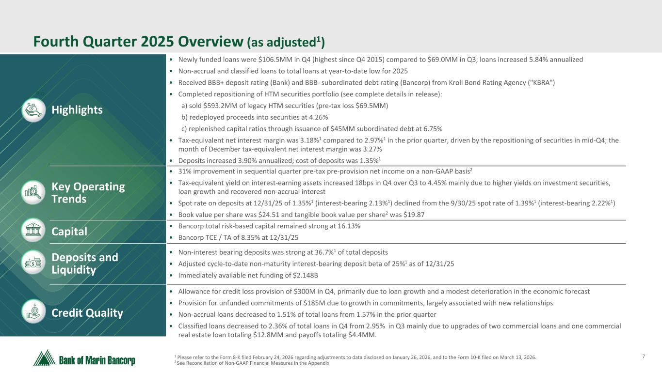 2 Text 95,96,96 Light Gray 232, 232, 232 Black 0, 0, 0 White 255, 255, 255 Accent 1 7,89,52 Accent 2 248,153,40 Accent 3 254,217,129 Accent 4 52,153,70 Accent 5 5,39,67 Accent 6 171,184,195 Forward-Looking Statements This discussion of financial results includes forward-looking statements within the meaning of Section 27A of the Securities Act of 1933, as amended, (the "1933 Act") and Section 21E of the Securities Exchange Act of 1934, as amended, (the "1934 Act"). Those sections of the 1933 Act and 1934 Act provide a "safe harbor" for forward-looking statements to encourage companies to provide prospective information about their financial performance so long as they provide meaningful, cautionary statements identifying important factors that could cause actual results to differ significantly from projected results. Our forward-looking statements include descriptions of plans or objectives of management for future operations, products or services, and forecasts of revenues, earnings or other measures of economic performance. Forward-looking statements can be identified by the fact that they do not relate strictly to historical or current facts. They often include the words "believe," "expect," "intend," "estimate" or words of similar meaning, or future or conditional verbs preceded by "will," "would," "should," "could" or "may." Forward-looking statements are based on management's current expectations regarding economic, legislative, and regulatory issues that may affect our earnings in future periods. Factors that could cause future results to vary materially from current management expectations include, but are not limited to, the preliminary nature of certain adjustments to prior financial statements disclosed in an 8-K filed by the Company on February 24, 2026 and the Form 10-K filed by the Company on March 13, 2026 and included in this presentation, general economic conditions and the economic uncertainty in the United States and abroad, including economic or other disruptions to financial markets caused by the Trump administration's approach to tariffs and trade, acts of terrorism, war, impacts from inflation, supply chain disruptions, changes in interest rates (including the actions taken by the Federal Reserve to control inflation), California's unemployment rate, deposit flows, real estate values, and expected future cash flows on loans and securities; the impact of adverse developments at other banks, including bank failures, that impact general sentiment regarding the stability and liquidity of banks; costs or effects of acquisitions; competition; changes in accounting principles, policies or guidelines; changes in legislation or regulation; natural disasters (such as wildfires and earthquakes in our area); adverse weather conditions; interruptions of utility service in our markets for sustained periods; and other economic, competitive, governmental, regulatory and technological factors (including external fraud and cybersecurity threats) affecting our operations, pricing, products and services; and successful integration of acquisitions. These and other important factors detailed in various securities law filings made periodically by Bancorp, copies of which are available from us at no charge. Forward-looking statements speak only as of the date they are made. Bancorp undertakes no obligation to release publicly the result of any revisions to these forward-looking statements that may be made to reflect events or circumstances that occur after the date of this press release or to reflect the occurrence of unanticipated events. GAAP to Non-GAAP Financial Measures This presentation includes some non-GAAP financial measures as shown in the Appendix of this presentation.