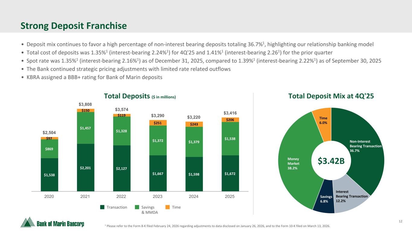12 Text 95,96,96 Light Gray 232, 232, 232 Black 0, 0, 0 White 255, 255, 255 Accent 1 7,89,52 Accent 2 248,153,40 Accent 3 254,217,129 Accent 4 52,153,70 Accent 5 5,39,67 Accent 6 171,184,195 Strong Deposit Franchise • Deposit mix continues to favor a high percentage of non-interest bearing deposits totaling 36.7%1, highlighting our relationship banking model • Total cost of deposits was 1.35%1 (interest-bearing 2.24%1) for 4Q'25 and 1.41%1 (interest-bearing 2.261) for the prior quarter • Spot rate was 1.35%1 (interest-bearing 2.16%1) as of December 31, 2025, compared to 1.39%1 (interest-bearing 2.22%1) as of September 30, 2025 • The Bank continued strategic pricing adjustments with limited rate related outflows • KBRA assigned a BBB+ rating for Bank of Marin deposits Total Deposit Mix at 4Q'25Total Deposits ($ in millions) $2,504 $3,808 $3,574 $3,290 $3,220 $3,416 $1,538 $2,201 $2,127 $1,667 $1,598 $1,672 $869 $1,457 $1,328 $1,372 $1,379 $1,538$97 $150 $119 $251 $243 $206 Transaction Savings & MMDA Time 2020 2021 2022 2023 2024 2025 Non-Interest Bearing Transaction 36.7% Interest Bearing Transaction 12.2% Savings 6.8% Money Market 38.2% Time 6.0% $3.42B 1 Please refer to the Form 8-K filed February 24, 2026 regarding adjustments to data disclosed on January 26, 2026, and to the Form 10-K filed on March 13, 2026.