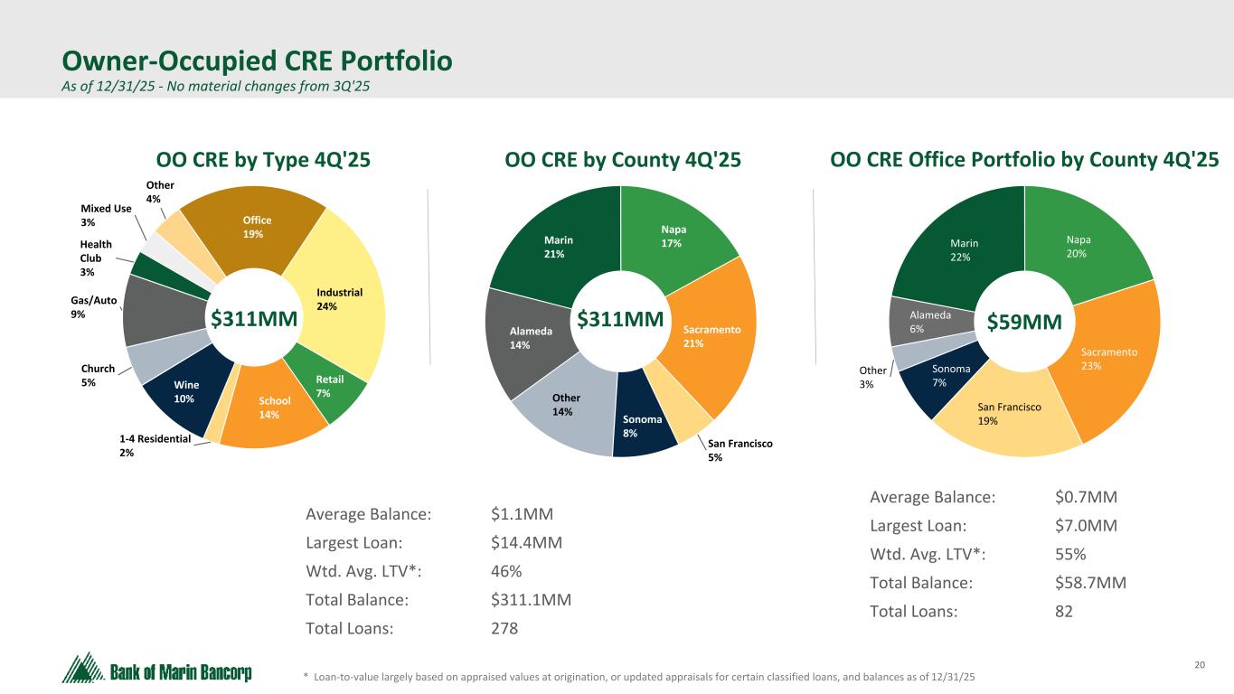 19 Text 95,96,96 Light Gray 232, 232, 232 Black 0, 0, 0 White 255, 255, 255 Accent 1 7,89,52 Accent 2 248,153,40 Accent 3 254,217,129 Accent 4 52,153,70 Accent 5 5,39,67 Accent 6 171,184,195 *Calculated for loans exceeding $1 million, based on the most recent annual review process Note: Sacramento includes surrounding regional counties NOO CRE Portfolio Diversified Across Property Type & County As of 12/31/25 - No material changes from 3Q'25 Average Balance: $1.8MM Largest Balance: $13.4MM Total # of Loans: 141 Wtd. Avg. LTV*: 60% Average Balance: $2.1MM Largest Balance: $14.2MM Total # of Loans: 87 Wtd. Avg. LTV*: 48% Average Balance: $1.9MM Largest Balance: $21.1MM Total # of Loans: 125 Wtd. Avg. LTV*: 62% San Francisco 3% Alameda 6% Sacramento 20% Napa 16% Other Bay Area 17% Other 6% Marin 16% Sonoma 16% San Francisco 9%Alameda 14% Sacramento 26% Napa 7% Other Bay Area 7% Other 4% Marin 8% Sonoma 25% San Francisco 19% Alameda 22% Sacramento 17% Napa 5% Other Bay Area 4% Other 8% Marin 9% Sonoma 16% Retail 4Q'25 Warehouse & Industrial 4Q'25 Multifamily 4Q'25 $251MM $180MM $240MM