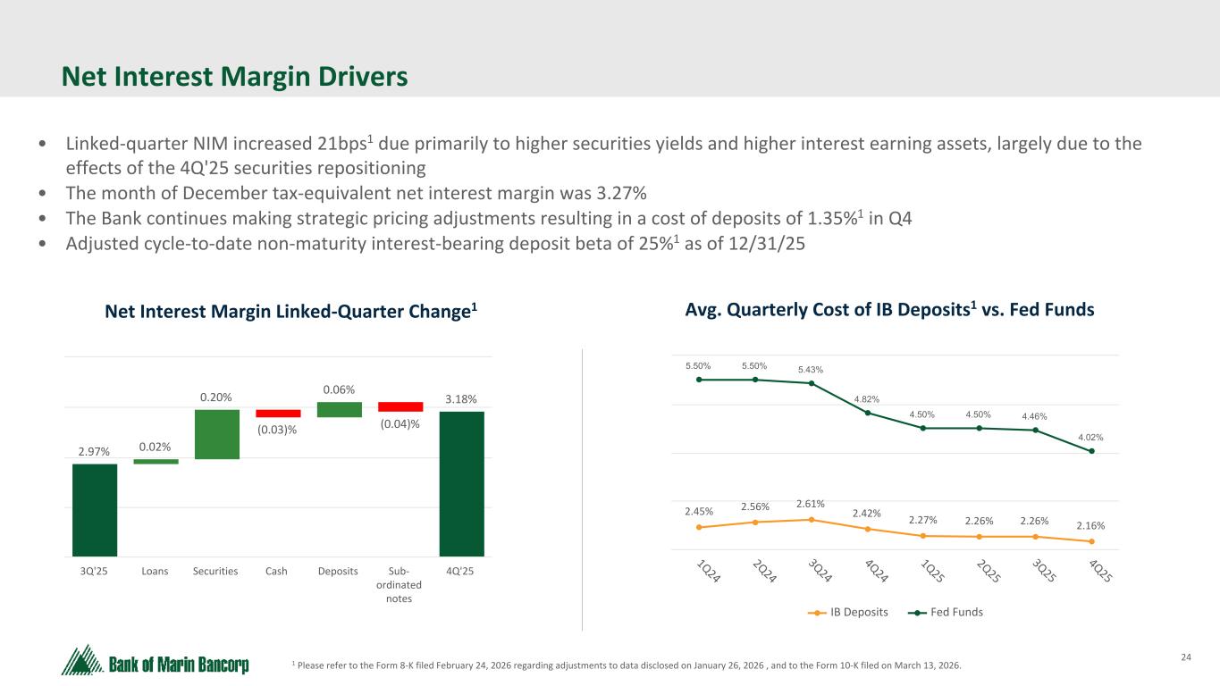 24 Text 95,96,96 Light Gray 232, 232, 232 Black 0, 0, 0 White 255, 255, 255 Accent 1 7,89,52 Accent 2 248,153,40 Accent 3 254,217,129 Accent 4 52,153,70 Accent 5 5,39,67 Accent 6 171,184,195 • Linked-quarter NIM increased 21bps1 due primarily to higher securities yields and higher interest earning assets, largely due to the effects of the 4Q'25 securities repositioning • The month of December tax-equivalent net interest margin was 3.27% • The Bank continues making strategic pricing adjustments resulting in a cost of deposits of 1.35%1 in Q4 • Adjusted cycle-to-date non-maturity interest-bearing deposit beta of 25%1 as of 12/31/25 Net Interest Margin Drivers 2.97% 0.02% 0.20% (0.03)% 0.06% (0.04)% 3.18% 3Q'25 Loans Securities Cash Deposits Sub- ordinated notes 4Q'25 Net Interest Margin Linked-Quarter Change1 2.45% 2.56% 2.61% 2.42% 2.27% 2.26% 2.26% 2.16% 5.50% 5.50% 5.43% 4.82% 4.50% 4.50% 4.46% 4.02% IB Deposits Fed Funds 1Q24 2Q24 3Q24 4Q24 1Q25 2Q25 3Q25 4Q25 Avg. Quarterly Cost of IB Deposits1 vs. Fed Funds 1 Please refer to the Form 8-K filed February 24, 2026 regarding adjustments to data disclosed on January 26, 2026 , and to the Form 10-K filed on March 13, 2026.