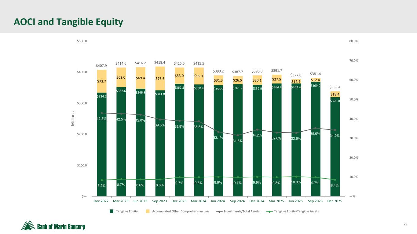 28 Text 95,96,96 Light Gray 232, 232, 232 Black 0, 0, 0 White 255, 255, 255 Accent 1 7,89,52 Accent 2 248,153,40 Accent 3 254,217,129 Accent 4 52,153,70 Accent 5 5,39,67 Accent 6 171,184,195 ($ in millions at Fair Value) History of Strong Asset Quality • Allowance for credit losses to total loans of 1.43% down slightly from the prior quarter • Consistent, robust credit culture and underwriting principles support strong asset quality • Net charge-offs have consistently been negligible for the last five years due to strong underwriting fundamentals, except that in 4Q'23 and 1Q'25 charge-offs included $406 and $809 thousand charged to the allowance due to the sales of acquired loans Non-accrual Loans / Total Loans Quarterly Progression 1.63% 1.59% 1.57% 1.51% 1.27% 4Q24 1Q25 2Q25 3Q25 4Q25 Net Charge-Offs (Recoveries) as % of Average Loans 0.00% 0.00% 0.02% 0.00% 0.00% 2021 2022 2023 2024 Q4 25 0.00% 0.25% 0.50% 0.75% 1.00%