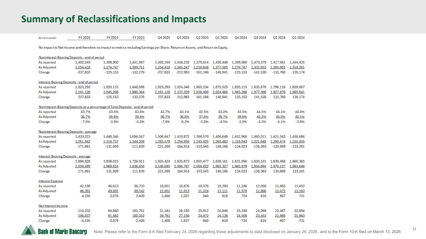 31 Text 95,96,96 Light Gray 232, 232, 232 Black 0, 0, 0 White 255, 255, 255 Accent 1 7,89,52 Accent 2 248,153,40 Accent 3 254,217,129 Accent 4 52,153,70 Accent 5 5,39,67 Accent 6 171,184,195 Reconciliation of GAAP to Non-GAAP Financial Measures (Excluding Loss on Sale of Securities) (in thousands; unaudited) Three months ended Year ended Pre-tax, pre-provision net income December 31, 2025 September 30, 2025 December 31, 2025 December 31, 2024 (Loss) income before (benefit from) provision for income taxes $ (57,375) $ 9,610 $ (52,483) $ (13,835) Provision for credit losses on loans 300 — 375 5,550 Provision for (reversal of) credit losses on unfunded loan commitments 185 — 185 (233) Pre-tax, pre-provision net (loss) income (GAAP) (56,890) 9,610 (51,923) (8,518) Adjustments: Losses on sale of investment securities from portfolio repositioning 69,466 — 88,202 32,541 Comparable pre-tax, pre-provision net income (non-GAAP) $ 12,576 $ 9,610 $ 36,279 $ 24,023