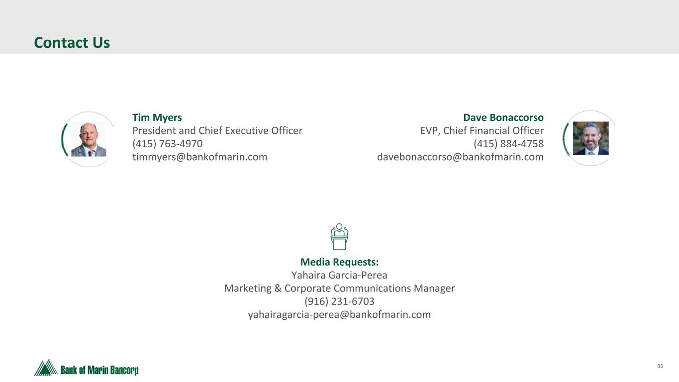 35 Text 95,96,96 Light Gray 232, 232, 232 Black 0, 0, 0 White 255, 255, 255 Accent 1 7,89,52 Accent 2 248,153,40 Accent 3 254,217,129 Accent 4 52,153,70 Accent 5 5,39,67 Accent 6 171,184,195 Contact Us Tim Myers President and Chief Executive Officer (415) 763-4970 timmyers@bankofmarin.com Dave Bonaccorso EVP, Chief Financial Officer (415) 884-4758 davebonaccorso@bankofmarin.com Media Requests: Yahaira Garcia-Perea Marketing & Corporate Communications Manager (916) 231-6703 yahairagarcia-perea@bankofmarin.com