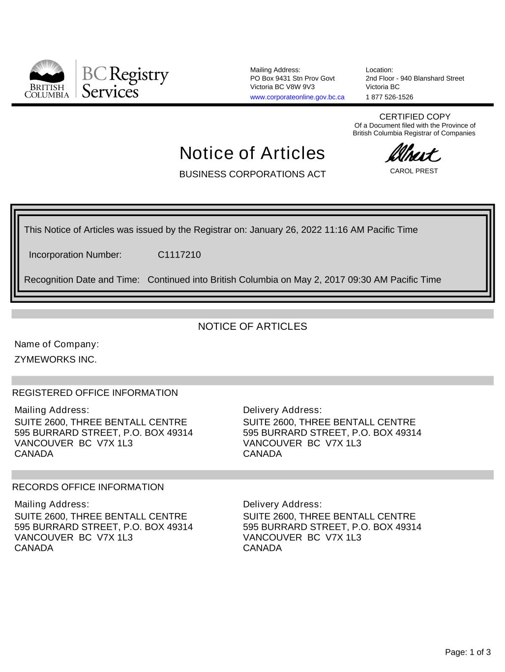 Mailing Address: PO Box 9431 Stn Prov Govt Victoria BC V8W 9V3 www.corporateonline.gov.bc.ca Location: 2nd Floor - 940 Blanshard Street Victoria BC 1 877 526-1526 Notice of Articles BUSINESS CORPORATIONS ACT CERTIFIED COPY Of a Document filed with the Province of British Columbia Registrar of Companies CAROL PREST This Notice of Articles was issued by the Registrar on: January 26, 2022 11:16 AM Pacific Time Incorporation Number: C1117210 Recognition Date and Time: Continued into British Columbia on May 2, 2017 09:30 AM Pacific Time NOTICE OF ARTICLES Name of Company: ZYMEWORKS INC. REGISTERED OFFICE INFORMATION Mailing Address: SUITE 2600, THREE BENTALL CENTRE 595 BURRARD STREET, P.O. BOX 49314 VANCOUVER BC V7X 1L3 CANADA Delivery Address: SUITE 2600, THREE BENTALL CENTRE 595 BURRARD STREET, P.O. BOX 49314 VANCOUVER BC V7X 1L3 CANADA RECORDS OFFICE INFORMATION Mailing Address: SUITE 2600, THREE BENTALL CENTRE 595 BURRARD STREET, P.O. BOX 49314 VANCOUVER BC V7X 1L3 CANADA Delivery Address: SUITE 2600, THREE BENTALL CENTRE 595 BURRARD STREET, P.O. BOX 49314 VANCOUVER BC V7X 1L3 CANADA Page: 1 of 3