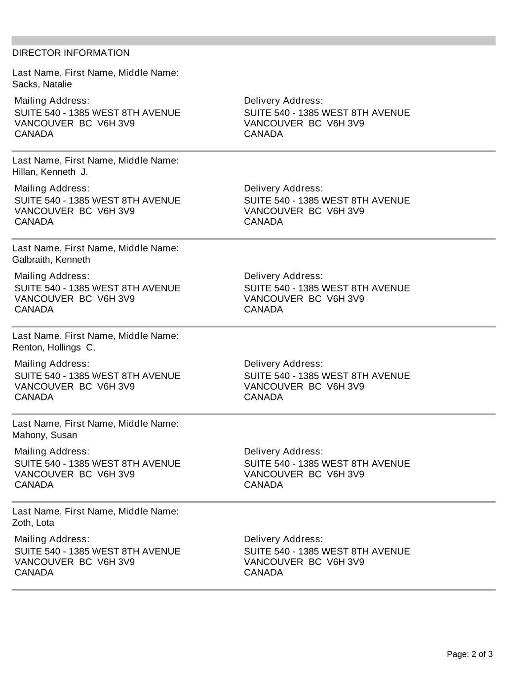 DIRECTOR INFORMATION Last Name, First Name, Middle Name: Sacks, Natalie Mailing Address: SUITE 540 - 1385 WEST 8TH AVENUE VANCOUVER BC V6H 3V9 CANADA Delivery Address: SUITE 540 - 1385 WEST 8TH AVENUE VANCOUVER BC V6H 3V9 CANADA Last Name, First Name, Middle Name: Hillan, Kenneth J. Mailing Address: SUITE 540 - 1385 WEST 8TH AVENUE VANCOUVER BC V6H 3V9 CANADA Delivery Address: SUITE 540 - 1385 WEST 8TH AVENUE VANCOUVER BC V6H 3V9 CANADA Last Name, First Name, Middle Name: Galbraith, Kenneth Mailing Address: SUITE 540 - 1385 WEST 8TH AVENUE VANCOUVER BC V6H 3V9 CANADA Delivery Address: SUITE 540 - 1385 WEST 8TH AVENUE VANCOUVER BC V6H 3V9 CANADA Last Name, First Name, Middle Name: Renton, Hollings C, Mailing Address: SUITE 540 - 1385 WEST 8TH AVENUE VANCOUVER BC V6H 3V9 CANADA Delivery Address: SUITE 540 - 1385 WEST 8TH AVENUE VANCOUVER BC V6H 3V9 CANADA Last Name, First Name, Middle Name: Mahony, Susan Mailing Address: SUITE 540 - 1385 WEST 8TH AVENUE VANCOUVER BC V6H 3V9 CANADA Delivery Address: SUITE 540 - 1385 WEST 8TH AVENUE VANCOUVER BC V6H 3V9 CANADA Last Name, First Name, Middle Name: Zoth, Lota Mailing Address: SUITE 540 - 1385 WEST 8TH AVENUE VANCOUVER BC V6H 3V9 CANADA Delivery Address: SUITE 540 - 1385 WEST 8TH AVENUE VANCOUVER BC V6H 3V9 CANADA Page: 2 of 3