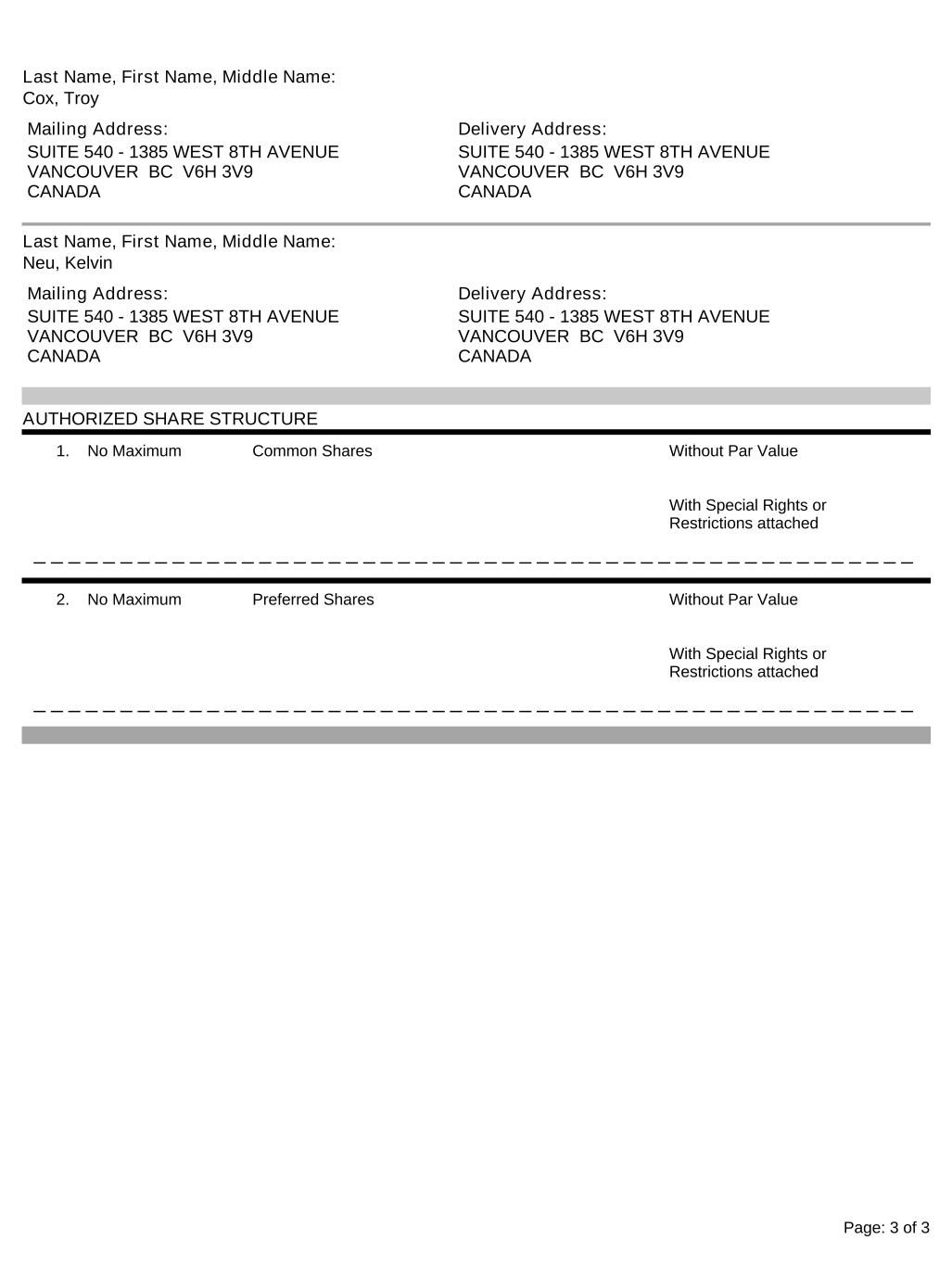 Last Name, First Name, Middle Name: Cox, Troy Mailing Address: SUITE 540 - 1385 WEST 8TH AVENUE VANCOUVER BC V6H 3V9 CANADA Delivery Address: SUITE 540 - 1385 WEST 8TH AVENUE VANCOUVER BC V6H 3V9 CANADA Last Name, First Name, Middle Name: Neu, Kelvin Mailing Address: SUITE 540 - 1385 WEST 8TH AVENUE VANCOUVER BC V6H 3V9 CANADA Delivery Address: SUITE 540 - 1385 WEST 8TH AVENUE VANCOUVER BC V6H 3V9 CANADA AUTHORIZED SHARE STRUCTURE 1. No Maximum Common Shares Without Par Value With Special Rights or Restrictions attached _ _ _ _ _ _ _ _ _ _ _ _ _ _ _ _ _ _ _ _ _ _ _ _ _ _ _ _ _ _ _ _ _ _ _ _ _ _ _ _ _ _ _ _ _ _ _ _ _ _ _ 2. No Maximum Preferred Shares Without Par Value With Special Rights or Restrictions attached _ _ _ _ _ _ _ _ _ _ _ _ _ _ _ _ _ _ _ _ _ _ _ _ _ _ _ _ _ _ _ _ _ _ _ _ _ _ _ _ _ _ _ _ _ _ _ _ _ _ _ Page: 3 of 3