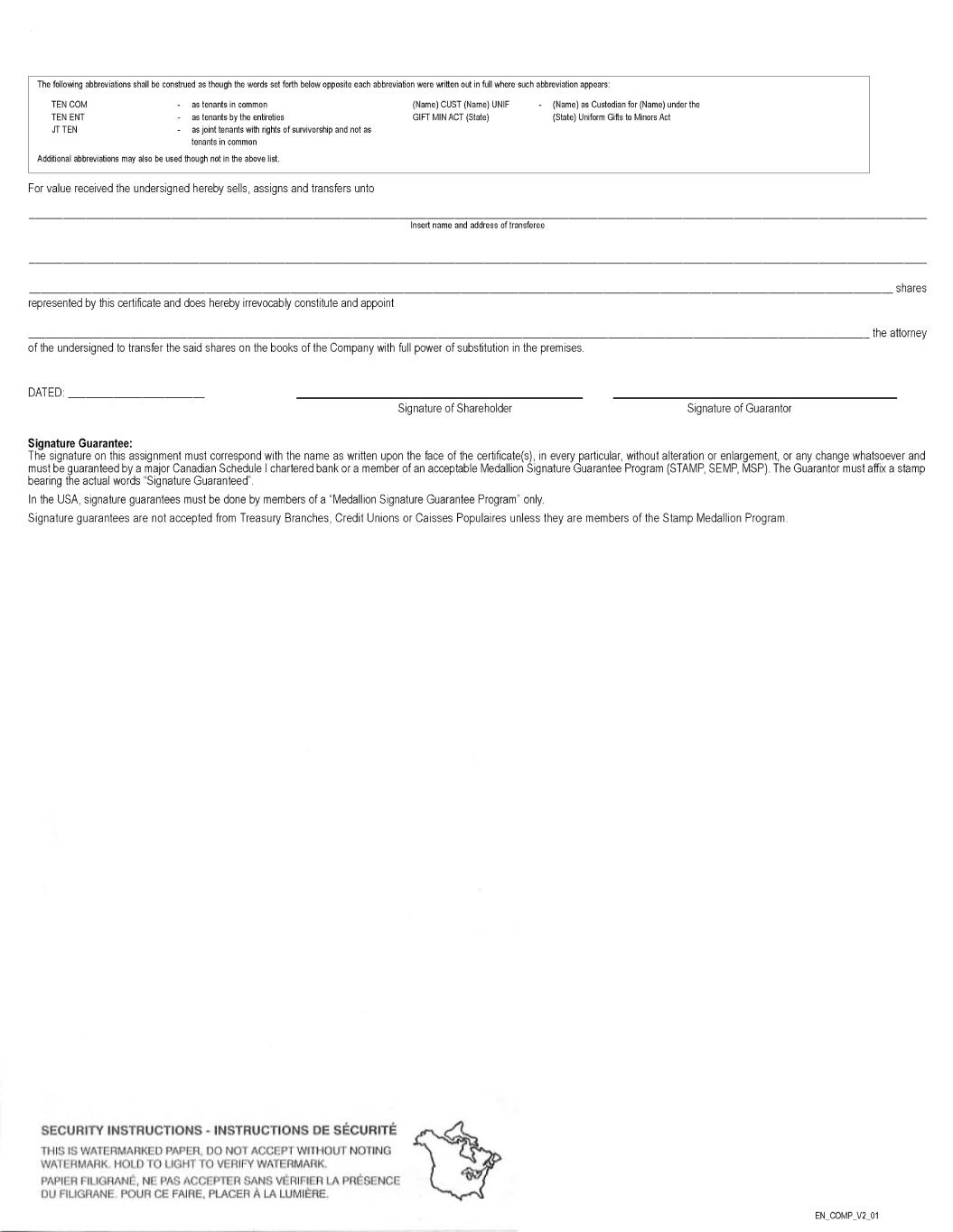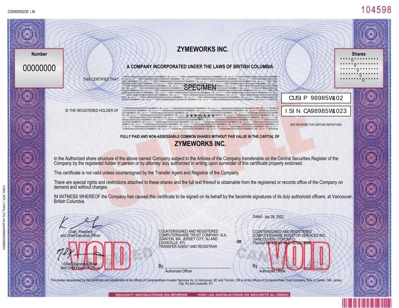 A COMPANY INCORPORATED UNDER THE LAWS OF BRITISH COLUMBIA SEE REVERSE FOR CERTAIN DEFINITIONS in the Authorized share structure of the above named Company subject to the Articles of the Company transferable on the Central Securities Register of the Company by the registered holder in person or by attorney duly authorized in writing upon surrender of this certificate properly endorsed. This certificate is not valid unless countersigned by the Transfer Agent and Registrar of the Company. There are special rights and restrictions attached to these shares and the full text thereof is obtainable from the registered or records office of the Company on demand and without charges. IN WITNESS WHEREOF the Company has caused this certificate to be signed on its behalf by the facsimile signatures of its duly authorized officers, at Vancouver, British Columbia. C0000000230 | M **SPECIMEN98985W10200000000ZYMEWORKS*INC.zero****SPECIMEN98985W10200000000ZYMEWORKS*INC.zero****SPECIMEN98985W10200000000ZYMEWORK S*INC.zero****SPECIMEN98985W10200000000ZYMEWORKS*INC.zero****SPECIMEN98985W10200000000ZYMEWORKS*INC.zero****SPECIMEN98985W1020000 0000ZYMEWORKS*INC.zero****SPECIMEN98985W10200000000ZYMEWORKS*INC.zero****SPECIMEN98985W10200000000ZYMEWORKS*INC.zero****SPECIMEN9 8985W10200000000ZYMEWORKS*INC.zero****SPECIMEN98985W10200000000ZYMEWORKS*INC.zero****SPECIMEN98985W10200000000ZYMEWORKS*INC.zero* ***SPECIMEN98985W10200000000ZYMEWORKS*INC.zero****SPECIMEN98985W10200000000ZYMEWORKS*INC.zero****SPECIMEN98985W10200000000ZYMEWOR KS*INC.zero****SPECIMEN98985W10200000000ZYMEWORKS*INC.zero****SPECIMEN98985W10200000000ZYMEWORKS*INC.zero****SPECIMEN98985W102000 00000ZYMEWORKS*INC.zero****SPECIMEN98985W10200000000ZYMEWORKS*INC.zero****SPECIMEN98985W10200000000ZYMEWORKS*INC.zero****SPECIMEN 98985W10200000000ZYMEWORKS*INC.zero****SPECIMEN98985W10200000000ZYMEWORKS*INC.zero****SPECIMEN98985W10200000000ZYMEWORKS*INC.zero ****SPECIMEN98985W10200000000ZYMEWORKS*INC.zero****SPECIMEN98985W10200000000ZYMEWORKS*INC.zero****SPECIMEN98985W10200000000ZYMEWO RKS*INC.zero****SPECIMEN98985W10200000000ZYMEWORKS*INC.zero****SPECIMEN98985W10200000000ZYMEWORKS*INC.zero****SPECIMEN98985W10200 000000ZYMEWORKS*INC.zero****SPECIMEN98985W10200000000ZYMEWORKS*INC.zero****SPECIMEN98985W10200000000ZYMEWORKS*INC.zero****SPECIME SPECI EN **098985W10200000000ZYMEWORKS*INC.zero****098985W10200000000ZYMEWORKS*INC.zero****098985W10200000000ZYMEWORKS*INC.zero****098985W 10200000000ZYMEWORKS*INC.zero****098985W10200000000ZYMEWORKS*INC.zero****098985W10200000000ZYMEWORKS*INC.zero****098985W102000000 00ZYMEWORKS*INC.zero****098985W10200000000ZYMEWORKS*INC.zero****098985W10200000000ZYMEWORKS*INC.zero****098985W10200000000ZYMEWOR KS*INC.zero****098985W10200000000ZYMEWORKS*INC.zero****098985W10200000000ZYMEWORKS*INC.zero****098985W10200000000ZYMEWORKS*INC.ze ro****098985W10200000000ZYMEWORKS*INC.zero****098985W10200000000ZYMEWORKS*INC.zero****098985W10200000000ZYMEWORKS*INC.zero****098 985W10200000000ZYMEWORKS*INC.zero****098985W10200000000ZYMEWORKS*INC.zero****098985W10200000000ZYMEWORKS*INC.zero****098985W10200 000000ZYMEWORKS*INC.zero****098985W10200000000ZYMEWORKS*INC.zero****098985W10200000000ZYMEWORKS*INC.zero****098985W10200000000ZYM EWORKS*INC.zero****098985W10200000000ZYMEWORKS*INC.zero****098985W10200000000ZYMEWORKS*INC.zero****098985W10200000000ZYMEWORKS*IN C.zero****098985W10200000000ZYMEWORKS*INC.zero****098985W10200000000ZYMEWORKS*INC.zero****098985W10200000000ZYMEWORKS*INC.zero*** *098985W10200000000ZYMEWORKS*INC.zero****098985W10200000000ZYMEWORKS*INC.zero****098985W10200000000ZYMEWORKS*INC.zero****098985W1 * * * 0 * * Jan 28, 2022 00000000 Number Shares FULLY PAID AND NON-ASSESSABLE COMMON SHARES WITHOUT PAR VALUE IN THE CAPITAL OF IS THE REGISTERED HOLDER OF THIS CERTIFIES THAT Dated: The shares represented by this certificate are transferable at the offices of Computershare Investor Services Inc. in Vancouver, BC and Toronto, ON or at the offices of Computershare Trust Company, N.A. in Canton, MA, Jersey City, NJ and Louisville, KY. ZYMEWORKS INC. COUNTERSIGNED AND REGISTERED COMPUTERSHARE TRUST COMPANY, N.A. (CANTON, MA, JERSEY CITY, NJ AND LOUISVILLE, KY) TRANSFER AGENT AND REGISTRAR COUNTERSIGNED AND REGISTERED COMPUTERSHARE INVESTOR SERVICES INC. (VANCOUVER) (TORONTO) TRANSFER AGENT AND REGISTRAROR By _____________________________ Authorized Officer By ____________________________ Authorized Officer Chair, President and Chief Executive Officer Chief Operating Officer and Chief Financial Officer * * * * 0 * * * * * * * * * * * * * * 0 * * * * * * * * * * * * * * 0 * * * * * * * * * * * * * * 0 * * * * * * * * * * * * * * 0 * * * * * CUSIP 98985W102 ISIN CA98985W1023 ZYMEWORKS INC. C SA E _W IP_Y Z M Q _C 01.m tl.pulls/000001/000001/i