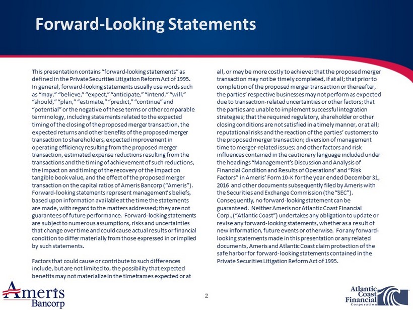 Forward - Looking Statements 2 This presentation contains “forward - looking statements” as defined in the Private Securities Litigation Reform Act of 1995. In general, forward - looking statements usually use words such as “may,” “believe,” “expect,” “anticipate,” “intend,” “will,” “should,” “plan,” “estimate,” “predict,” “continue” and “potential” or the negative of these terms or other comparable terminology, including statements related to the expected timing of the closing of the proposed merger transaction, the expected returns and other benefits of the proposed merger transaction to shareholders, expected improvement in operating efficiency resulting from the proposed merger transaction, estimated expense reductions resulting from the transactions and the timing of achievement of such reductions, the impact on and timing of the recovery of the impact on tangible book value, and the effect of the proposed merger transaction on the capital ratios of Ameris Bancorp (“Ameris”). Forward - looking statements represent management’s beliefs, based upon information available at the time the statements are made, with regard to the matters addressed; they are not guarantees of future performance. Forward - looking statements are subject to numerous assumptions, risks and uncertainties that change over time and could cause actual results or financial condition to differ materially from those expressed in or implied by such statements. Factors that could cause or contribute to such differences include, but are not limited to, the possibility that expected benefits may not materialize in the timeframes expected or at all, or may be more costly to achieve; that the proposed merger transaction may not be timely completed, if at all; that prior to completion of the proposed merger transaction or thereafter, the parties’ respective businesses may not perform as expected due to transaction - related uncertainties or other factors; that the parties are unable to implement successful integration strategies; that the required regulatory, shareholder or other closing conditions are not satisfied in a timely manner, or at all; reputational risks and the reaction of the parties’ customers to the proposed merger transaction; diversion of management time to merger - related issues; and other factors and risk influences contained in the cautionary language included under the headings “Management’s Discussion and Analysis of Financial Condition and Results of Operations” and “Risk Factors” in Ameris’ Form 10 - K for the year ended December 31, 2016 and other documents subsequently filed by Ameris with the Securities and Exchange Commission (the “SEC”). Consequently, no forward - looking statement can be guaranteed. Neither Ameris nor Atlantic Coast Financial Corp .,(“ Atlantic Coast”) undertakes any obligation to update or revise any forward - looking statements, whether as a result of new information, future events or otherwise. For any forward - looking statements made in this presentation or any related documents, Ameris and Atlantic Coast claim protection of the safe harbor for forward - looking statements contained in the Private Securities Litigation Reform Act of 1995.