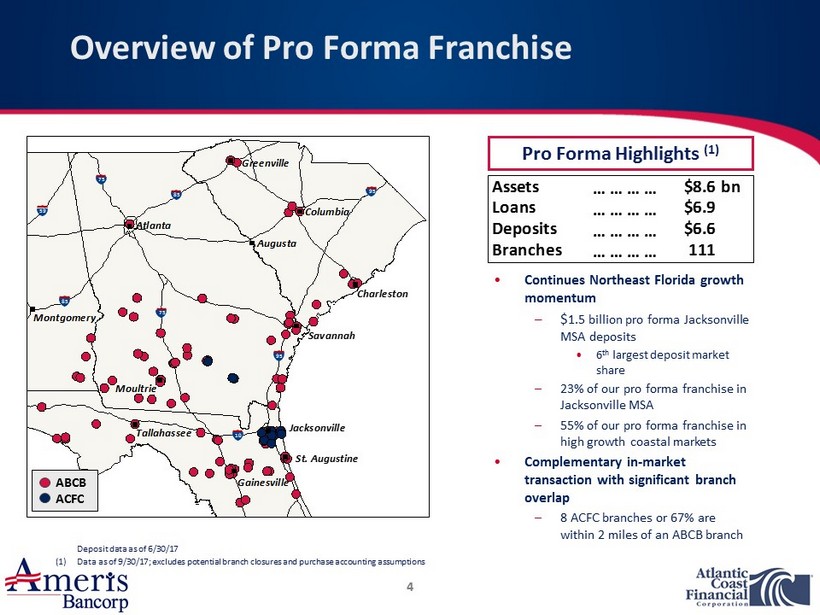 Forward - Looking Statements 2 This presentation contains “forward - looking statements” as defined in the Private Securities Litigation Reform Act of 1995. In general, forward - looking statements usually use words such as “may,” “believe,” “expect,” “anticipate,” “intend,” “will,” “should,” “plan,” “estimate,” “predict,” “continue” and “potential” or the negative of these terms or other comparable terminology, including statements related to the expected timing of the closing of the proposed merger transaction, the expected returns and other benefits of the proposed merger transaction to shareholders, expected improvement in operating efficiency resulting from the proposed merger transaction, estimated expense reductions resulting from the transactions and the timing of achievement of such reductions, the impact on and timing of the recovery of the impact on tangible book value, and the effect of the proposed merger transaction on the capital ratios of Ameris Bancorp (“Ameris”). Forward - looking statements represent management’s beliefs, based upon information available at the time the statements are made, with regard to the matters addressed; they are not guarantees of future performance. Forward - looking statements are subject to numerous assumptions, risks and uncertainties that change over time and could cause actual results or financial condition to differ materially from those expressed in or implied by such statements. Factors that could cause or contribute to such differences include, but are not limited to, the possibility that expected benefits may not materialize in the timeframes expected or at all, or may be more costly to achieve; that the proposed merger transaction may not be timely completed, if at all; that prior to completion of the proposed merger transaction or thereafter, the parties’ respective businesses may not perform as expected due to transaction - related uncertainties or other factors; that the parties are unable to implement successful integration strategies; that the required regulatory, shareholder or other closing conditions are not satisfied in a timely manner, or at all; reputational risks and the reaction of the parties’ customers to the proposed merger transaction; diversion of management time to merger - related issues; and other factors and risk influences contained in the cautionary language included under the headings “Management’s Discussion and Analysis of Financial Condition and Results of Operations” and “Risk Factors” in Ameris’ Form 10 - K for the year ended December 31, 2016 and other documents subsequently filed by Ameris with the Securities and Exchange Commission (the “SEC”). Consequently, no forward - looking statement can be guaranteed. Neither Ameris nor Atlantic Coast Financial Corp .,(“ Atlantic Coast”) undertakes any obligation to update or revise any forward - looking statements, whether as a result of new information, future events or otherwise. For any forward - looking statements made in this presentation or any related documents, Ameris and Atlantic Coast claim protection of the safe harbor for forward - looking statements contained in the Private Securities Litigation Reform Act of 1995.