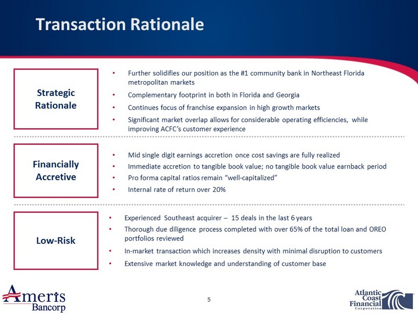 Montgomery Gainesville St. Augustine Tallahassee Savannah Greenville Atlanta Moultrie Charleston Jacksonville Augusta Columbia Overview of Pro Forma Franchise 4 Deposit data as of 6/30/17 (1) Data as of 9/30/17; excludes potential branch closures and purchase accounting assumptions Pro Forma Highlights (1) Assets … … … … $8.6bnLoans … … … … $6.9 Deposits … … … … $6.6 Branches … … … … 111 • Continues Northeast Florida growth momentum – $ 1.5 billion pro forma Jacksonville MSA deposits • 6 th largest deposit market share – 23% of our pro forma franchise in Jacksonville MSA – 55% of our pro forma franchise in high growth coastal markets • Complementary in - market transaction with significant branch overlap – 8 ACFC branches or 67% are within 2 miles of an ABCB branch 85 95 75 10 95 85 75 59 ABCB ACFC